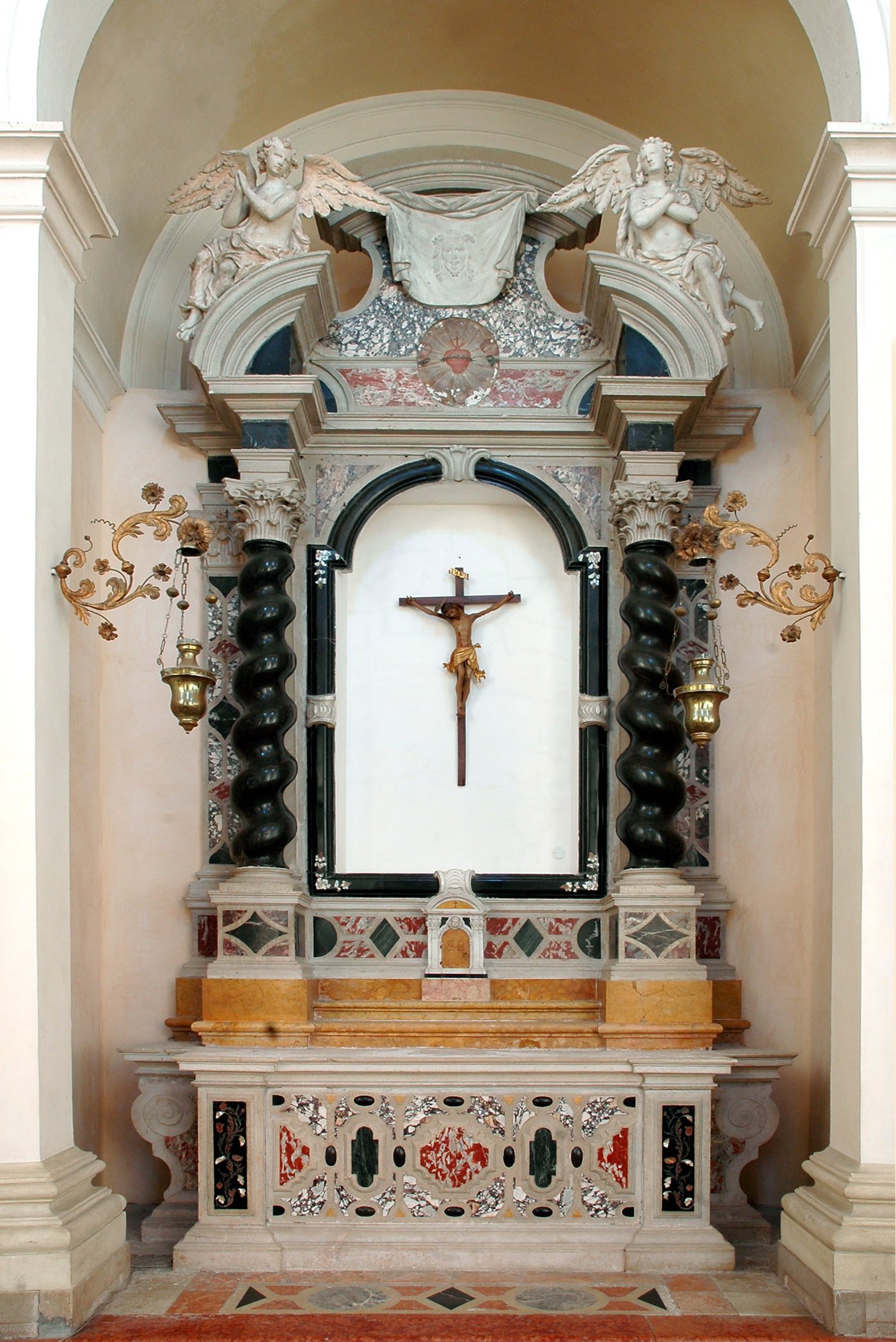 L’altare maggiore barocco, in marmi policromi, ospita la statua lignea dello Scalambrin, fortunosamente scampata alle fiamme del 1945. Interessante l’acquasantiera (XVII secolo?), formata da quattro petali con al centro un calice stilizzato con l’ostia e la croce.