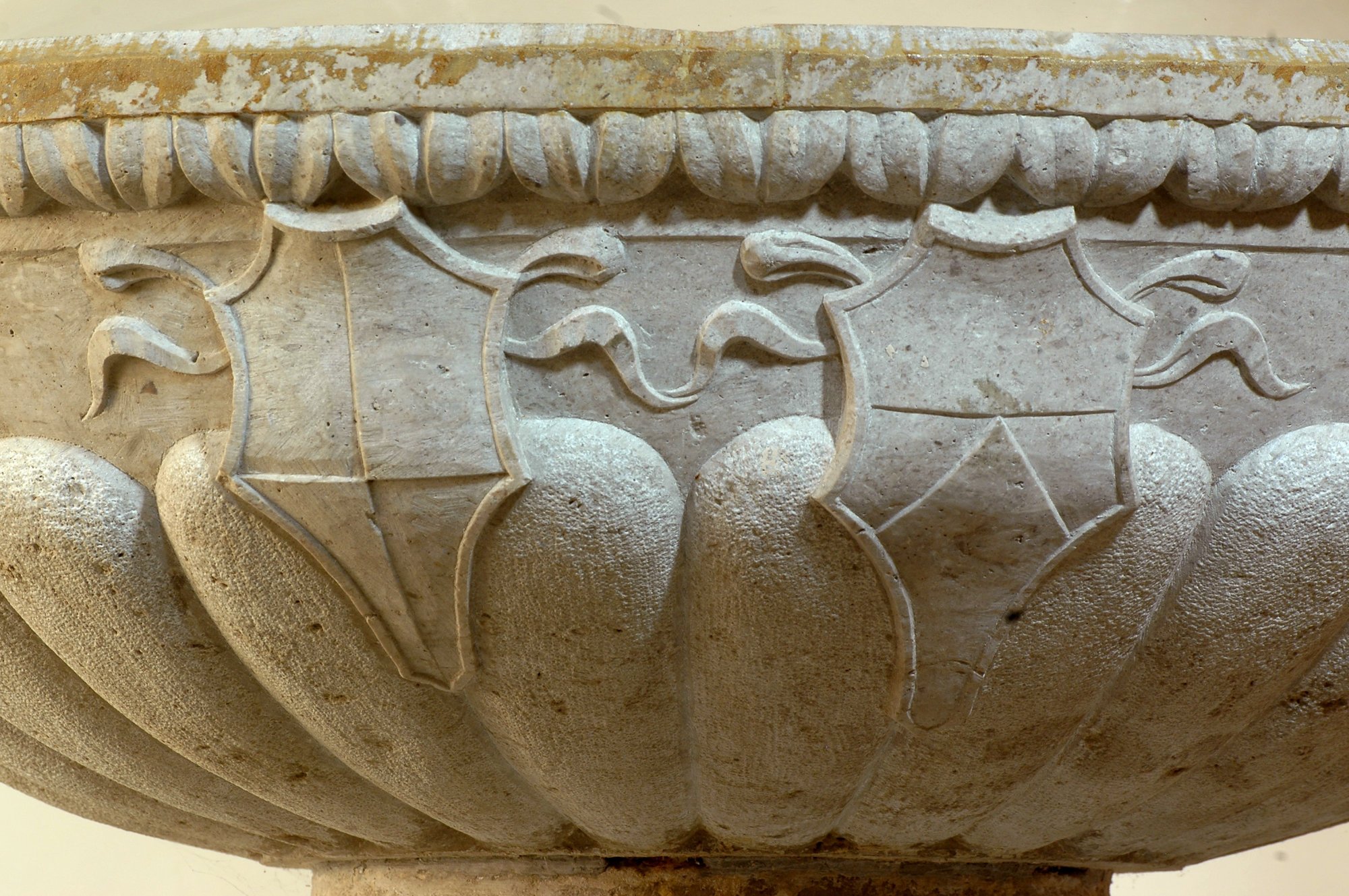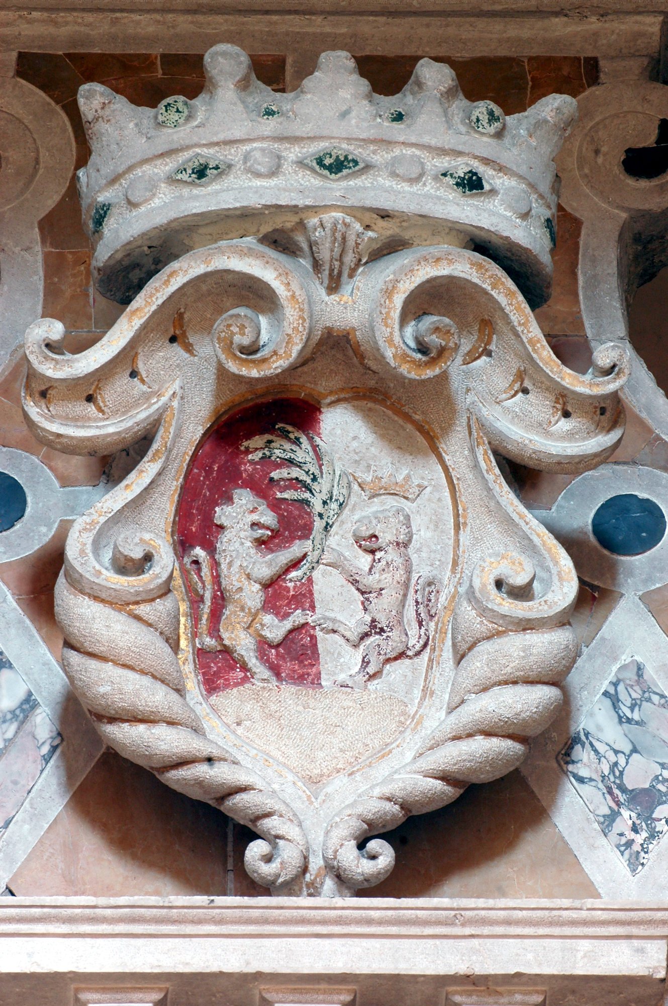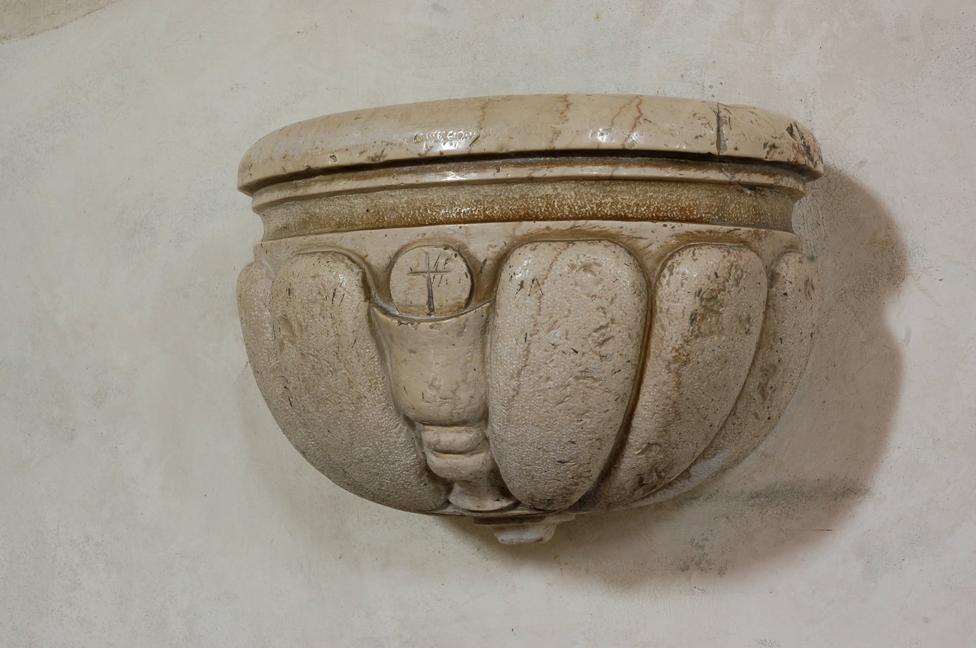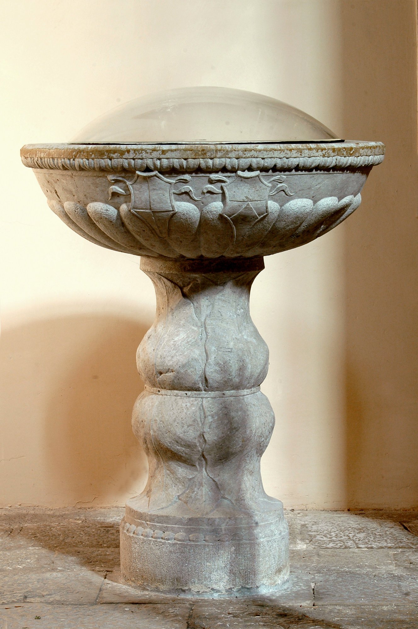L’elegante acquasantiera, con largo fusto e catino decorato a motivi floreali, pare frutto di rifacimenti e integrazioni e dovrebbe risalire nelle sue varie parti al Cinque-Seicento.