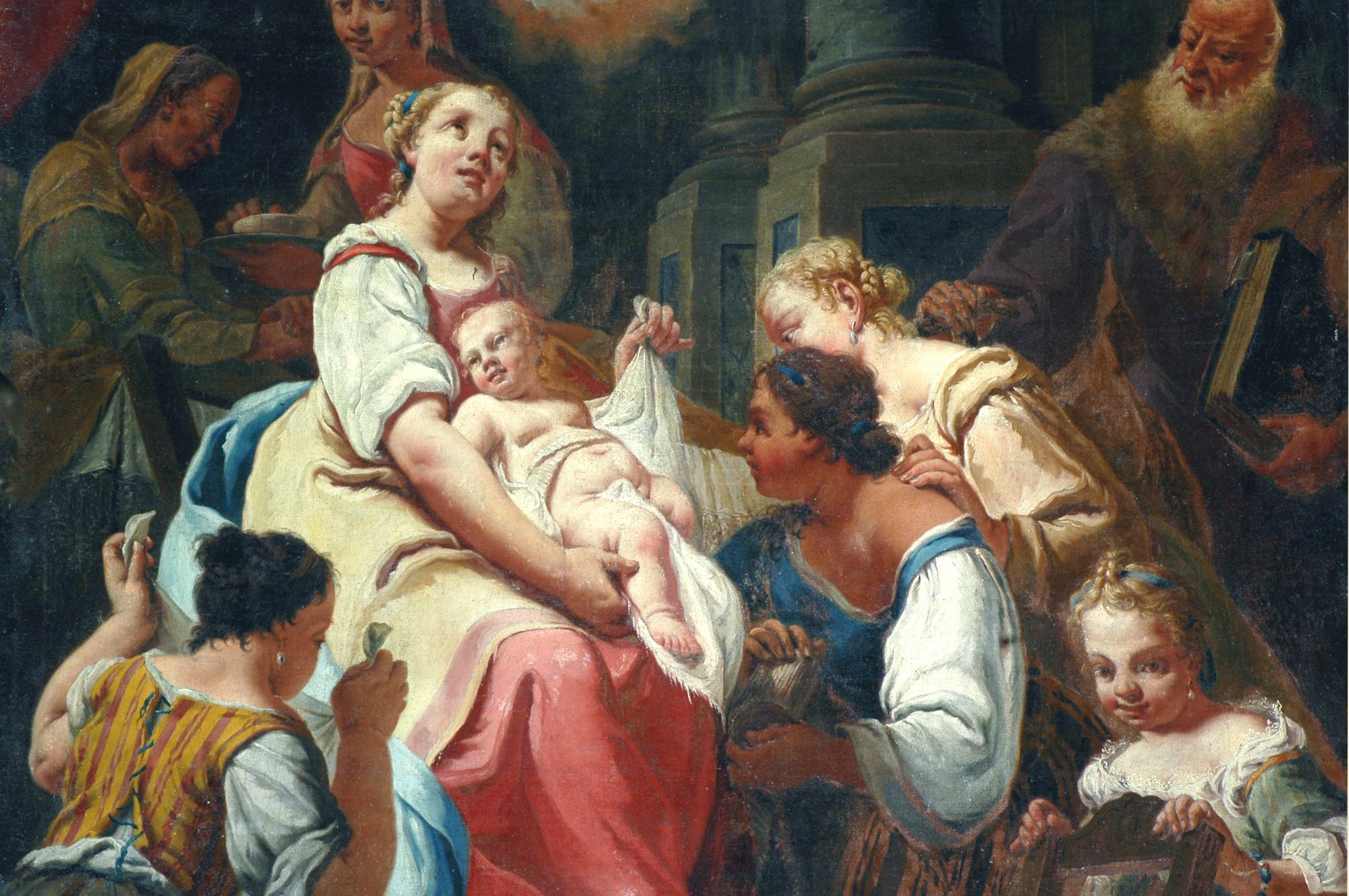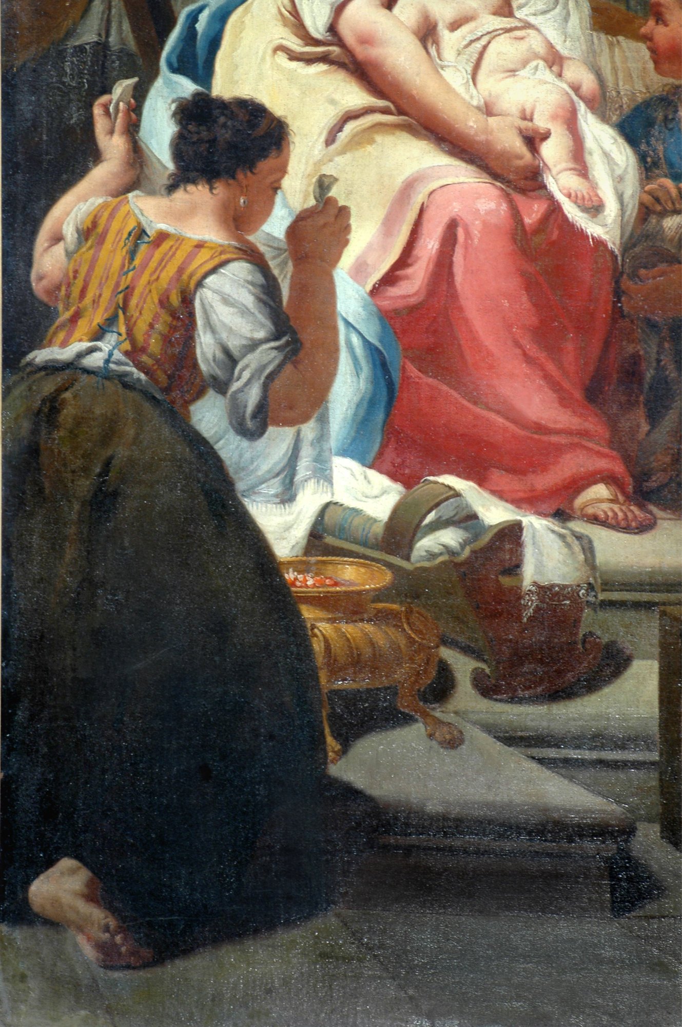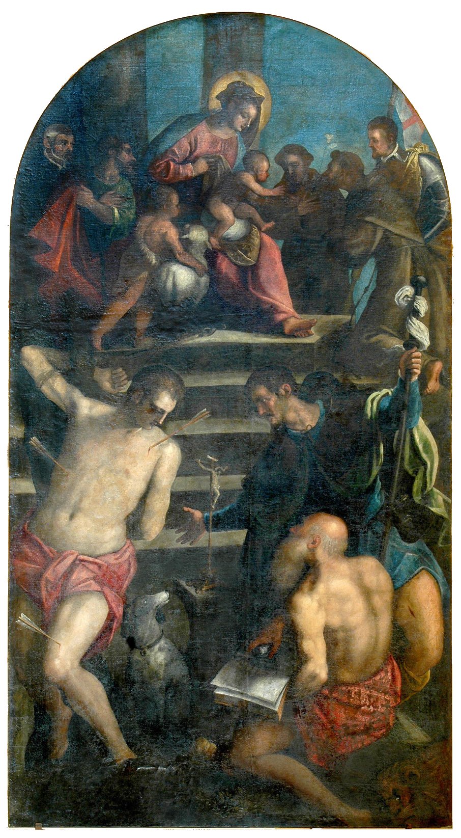 Sopra il battistero è collocata una pala dalla complessa iconografia, che raffigura la Madonna col Bambino in gloria, contornata da vari santi di devozione locale. Oltre a un santo non ben identificabile, compaiono infatti san Giacomo, san Giovannino con l’agnello, sant’Antonio di Padova, san Francesco d’Assisi, san Floriano (o san Giorgio?) e, in primo piano, san Sebastiano, san Rocco e un inatteso e vigoroso san Girolamo: opera non disprezzabile di ignoto pittore veneto di fine Cinquecento o inizi Seicento, che pare risentire di suggestioni provenienti da Palma il Giovane, ma anche di influssi di Tiziano e Tintoretto.