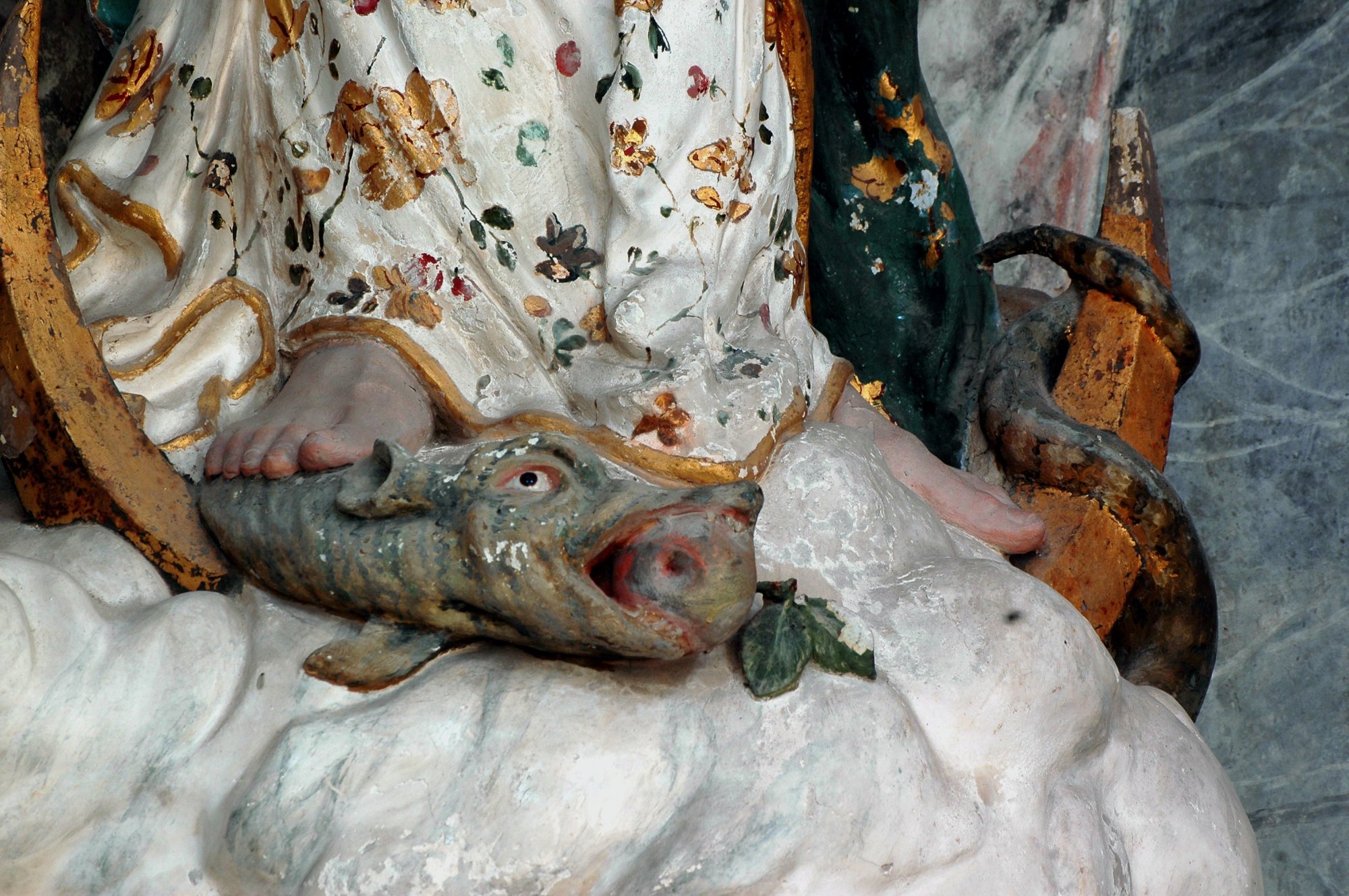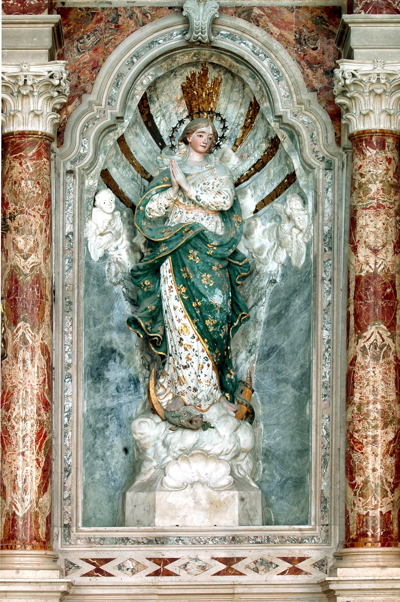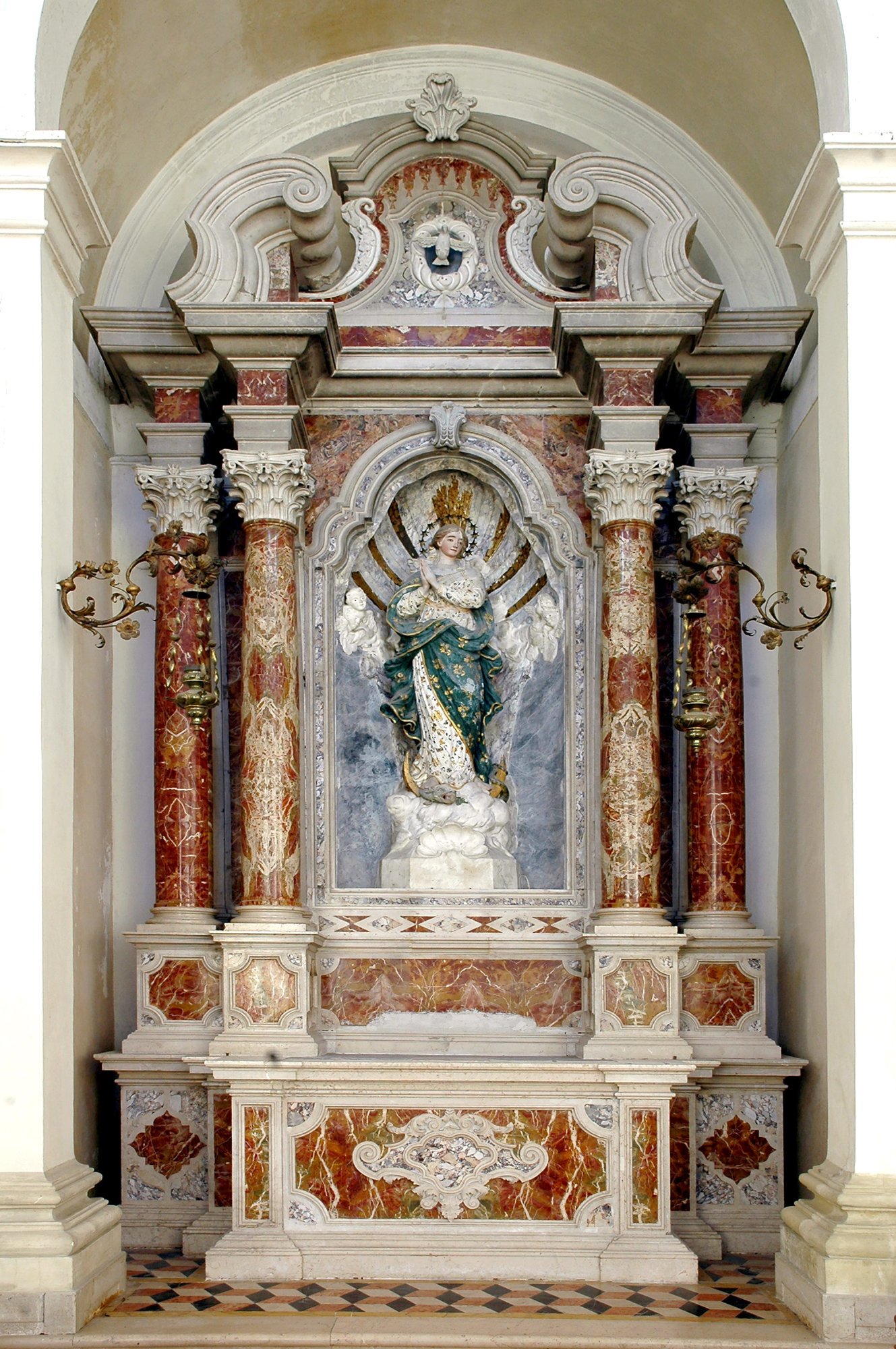 Dirigendoci verso la porta d’ingresso, troviamo l’altare dell’Immacolata Concezione, di proprietà dell’omonima confraternita, fondata forse bel 1588 e fusasi nel 1776 con l’antica confraternita del Santissimo Sacramento, a lungo operante nella parrocchiale di Ognissanti prima di trasferirsi a San Giacomo, quando quest’ultima divenne parrocchiale. Un’aggraziata statua policroma in gesso della Madonna, acquistata nel 1766, è inserita in una nicchia con fondale marmorizzato di un pregevole altare marmoreo, posto in opera nel 1763 e realizzato negli anni immediatamente precedenti da Alvise Copeta detto Saltariello, “taiapiera” di origine veneziana, ma da tempo stabilitosi a Polcenigo, dove morì nel 1785. Curiosamente, il Saltariello era allora “gastaldo” e scrivano del sodalizio committente e dunque pagava sé stesso a rate per l’esecuzione dell’altare.
