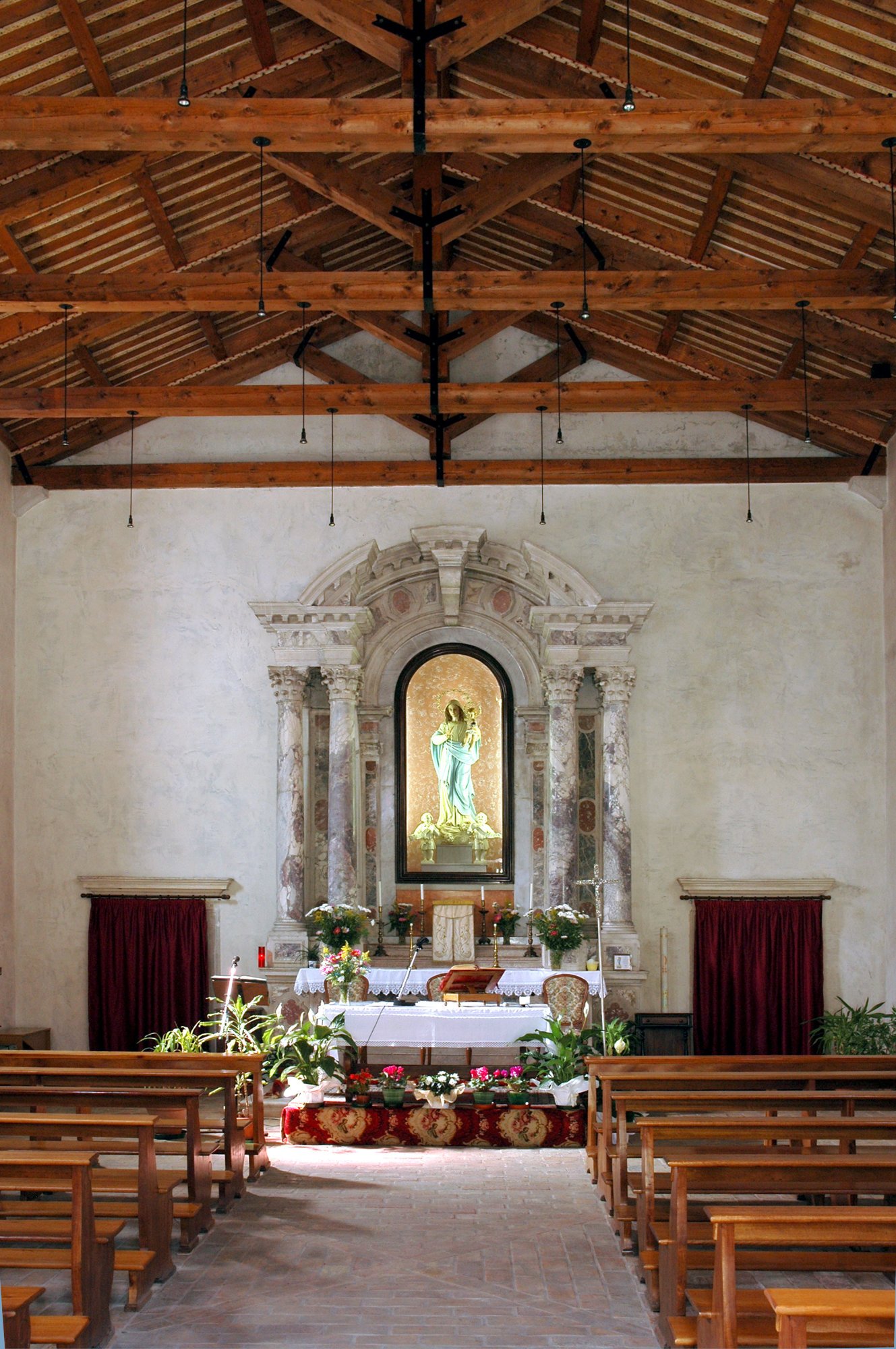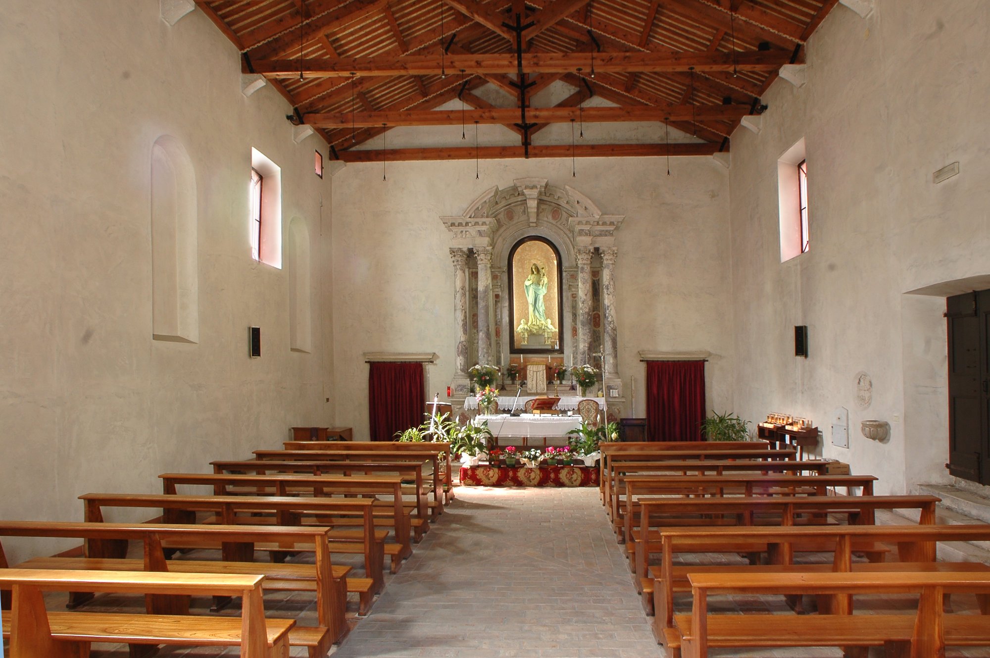 L’interno è costituito da un aula unica, senza presbiterio, con soffitto a capriate.