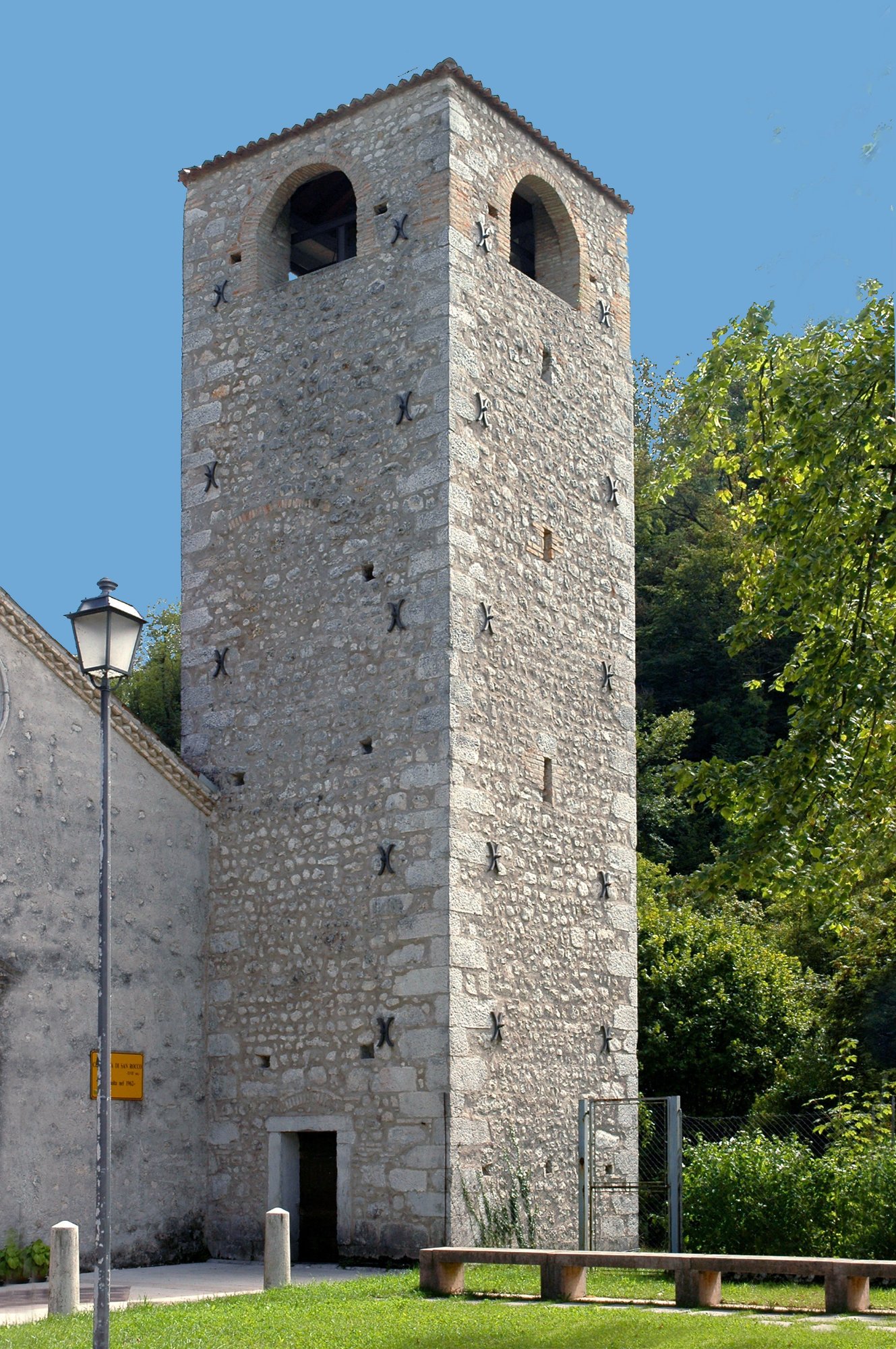 Interessante il vicino campanile, a canna quadrata e cin quattro ampie monofore: la sua struttura tozza e inconsueta ha fatto ritenere che in origine fosse una torre medievale appartenente a una cerchia muraria difensiva del borgo, poi riciclata come torre campanaria. In effetti nei pressi della chiesa è anticamente attestata una porta del borgo, detta appunto “Porta di San Rocco”, che chiudeva l’abitato verso ovest.