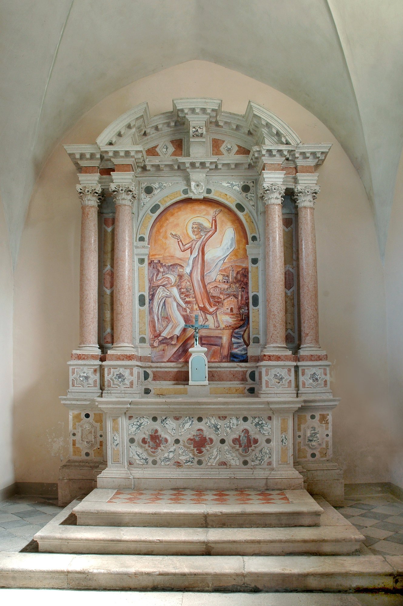 L’altare principale, in marmi policromi con gradevoli intarsi, è un garbato esempio di arte barocca, probabilmente del tardo Seicento o degli inizi del Settecento. Vi spicca un’intensa opera dell’artista Pierino Sam, datata 1985, raffigurante la Resurrezione.