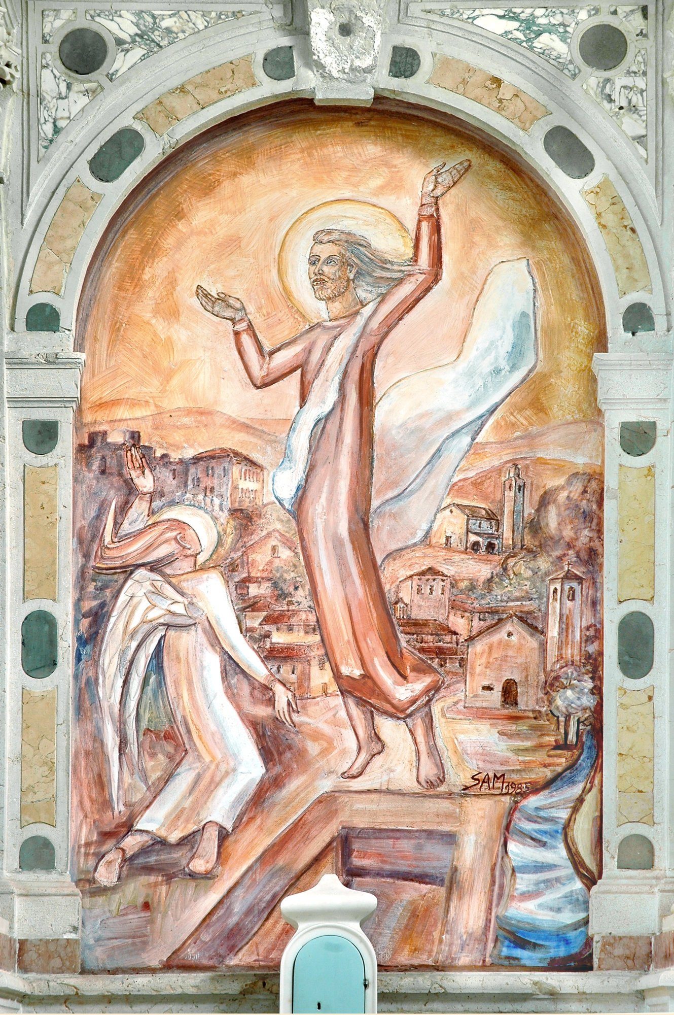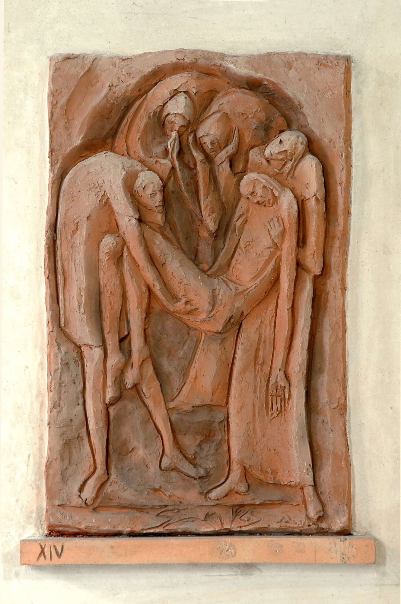 Alle pareti dell’aula si allineano le “stazioni” di un’energica e vivace Via Crucia, in terracotta, opera di Pierino Sam, datata 1965.