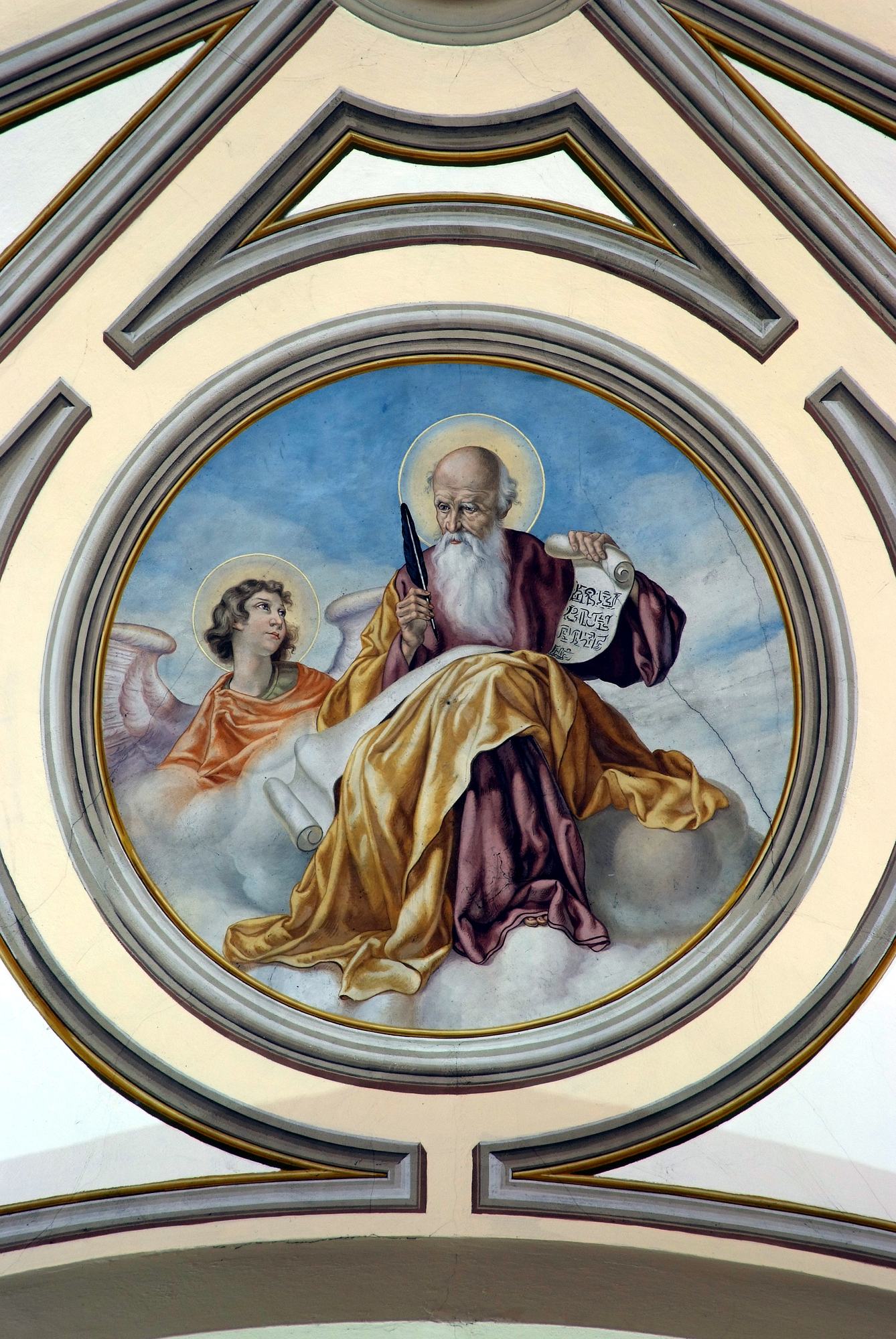 Proseguendo con lo sguardo verso l’alto si giunge al soffitto del coro, ornato da quattro ovali in cui il pittore Giacomo Monai (Nimis 1884-1978) inserì nel 1940 le figure degli Evangelisti i quali, colti nella stesura dei vangeli, sono affiancati dai consueti simboli.
