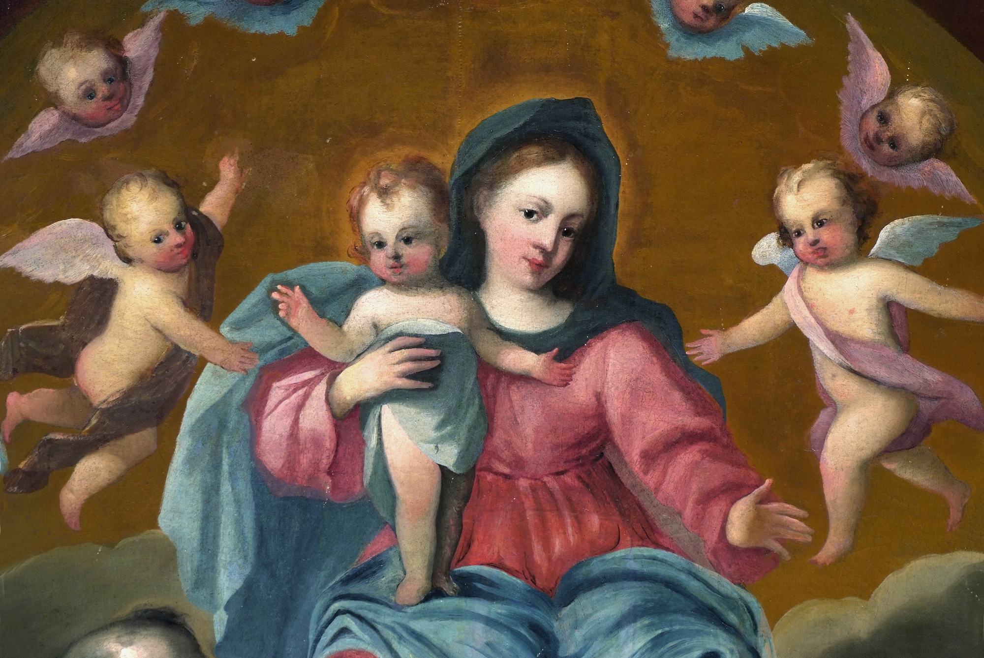 Il dipinto è stato messo in relazione ad analoghe soluzioni adottate dal veneziano Jacopo Palma il Giovane (1544-1628) in alcune chiese friulane ed è stato quindi attribuito ad un ignoto pittore appartenente a quella cerchia di artisti che guardavano alle indicazioni stilistiche palmesche, non riuscendo tuttavia sempre a tradurle con la medesima qualità pittorica. Quest’ultima caratteristica viene a tratti a mancare anche nel nostro dipinto che mostra elementi gradevoli, come la dolcezza del volto di Maria e la caratterizzazione di quello del santo milanese con il naso adunco e le lumeggiature nel pastorale, alternandosi a soluzioni meno felici, come i panneggi delle vesti.