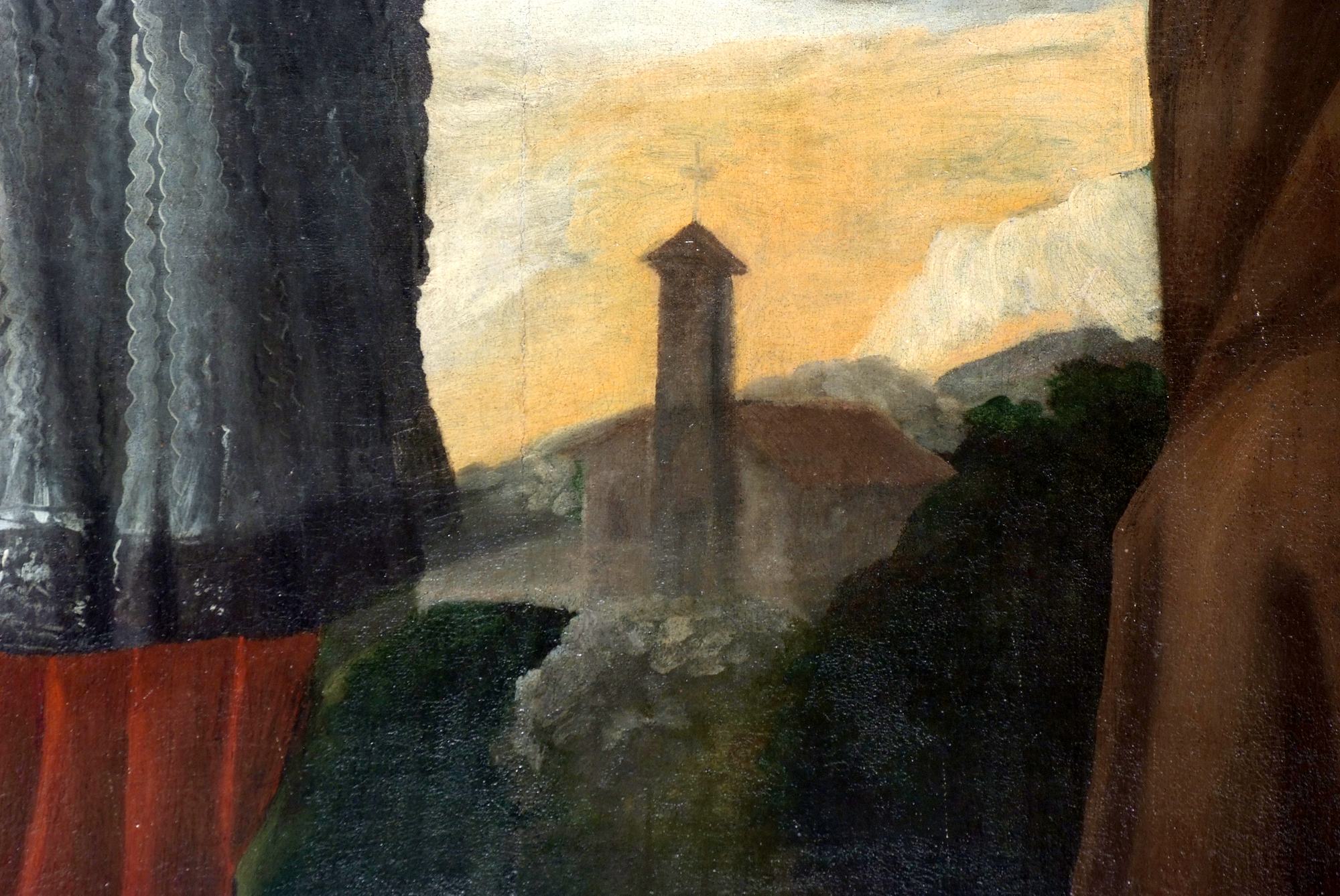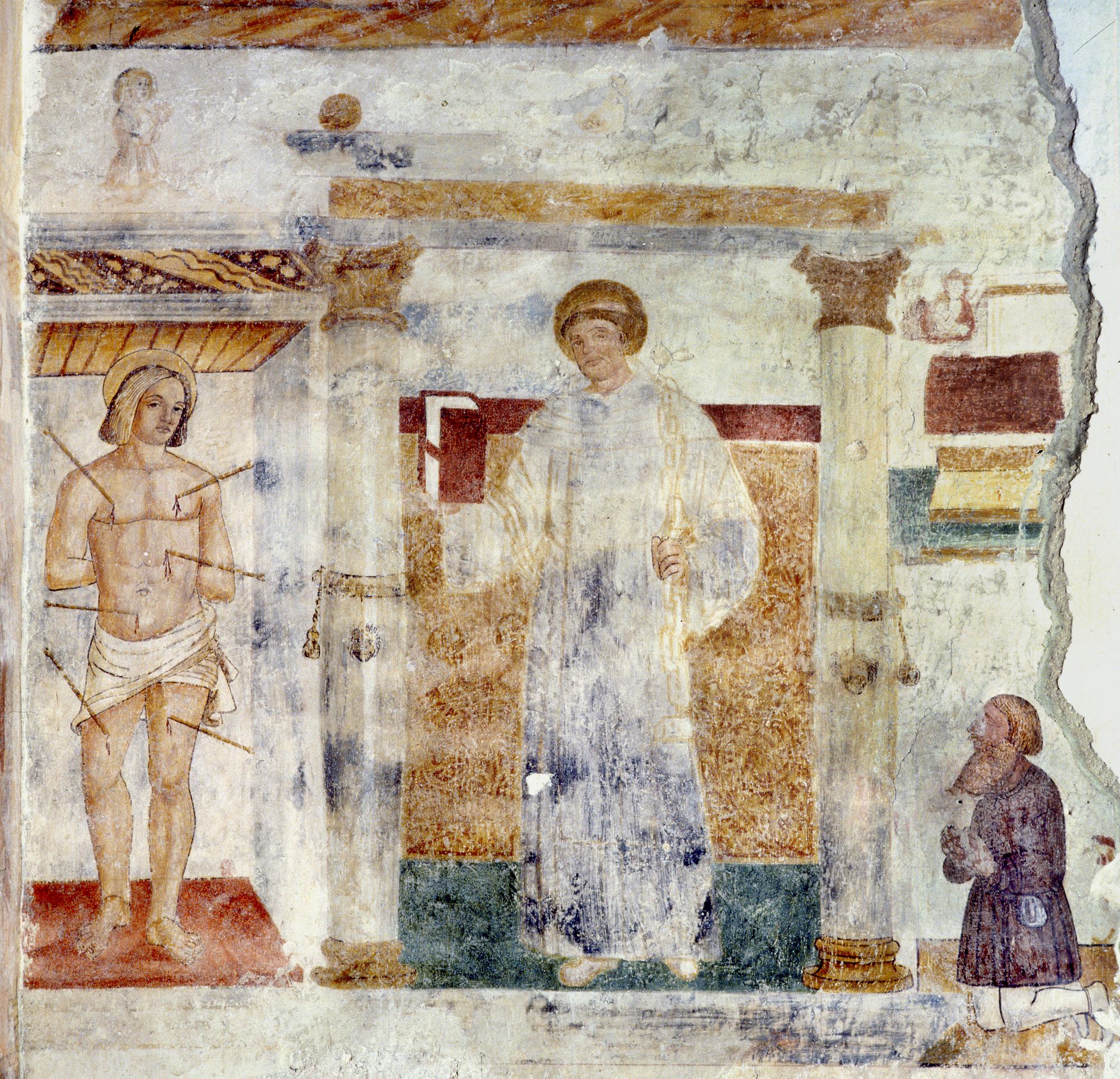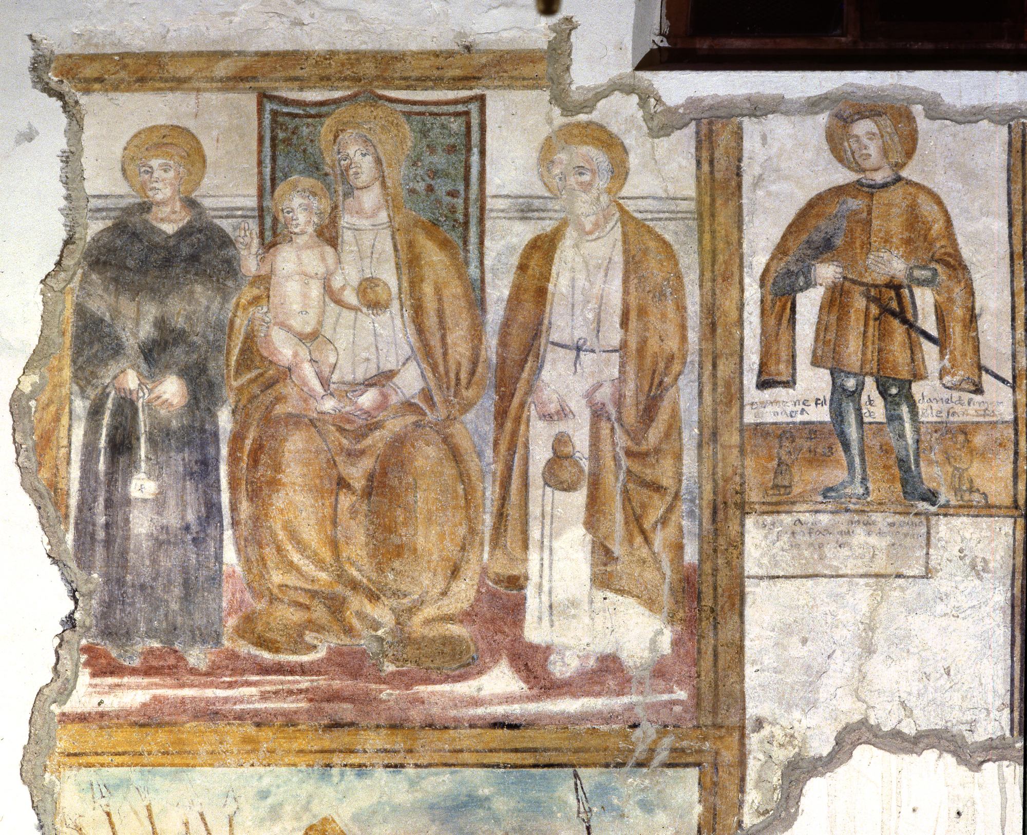 Chiesetta campestre di San Leonardo, affeschi parete destra, Madonna tra i Santi Bonifacio e Rocco, sec. XVI, Variano