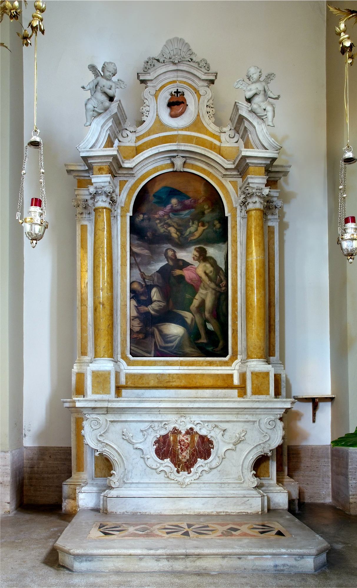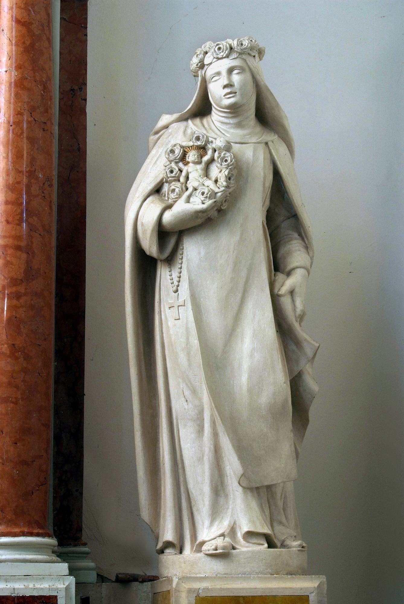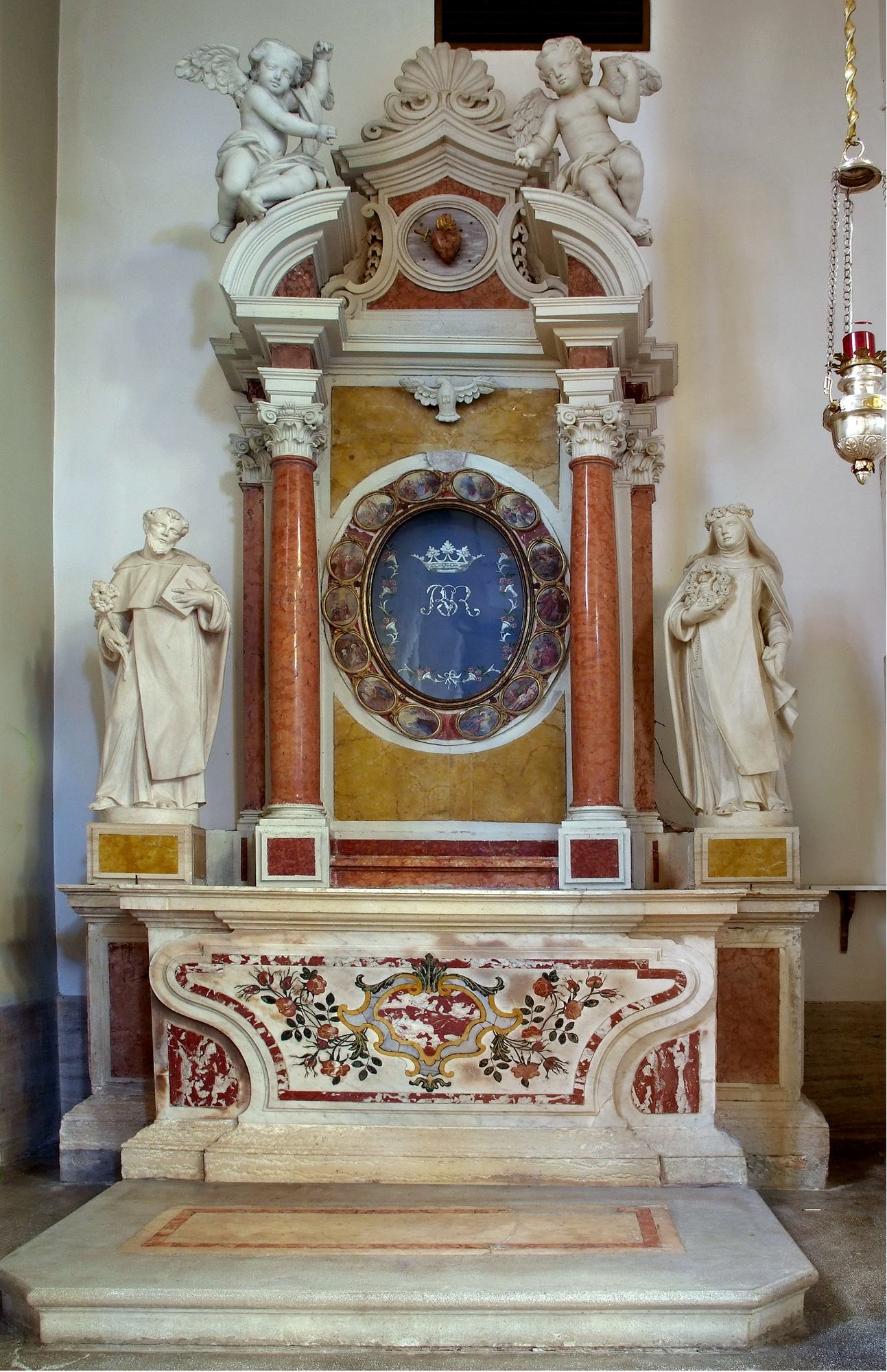 L’altare, dal prezioso paliotto intarsiato con un raffinato intreccio floreale di marmi policromi, è fiancheggiato dalle statue di San Domenico e Santa Rosa da Lima. Il fondatore dei Domenicani è rappresentato vestito con l’abito dell’Ordine e associato ai suoi consueti attributi: la stella in fronte e il libro in mano, emblemi della sapienza, e il giglio come segno di purezza. La santa è raffigurata come una giovane domenicana e con i simboli a lei propri, ossia la corona di rose sul capo e il Bambino Gesù, in questo caso inserito al centro della ghirlanda rosata che la donna tiene in mano.