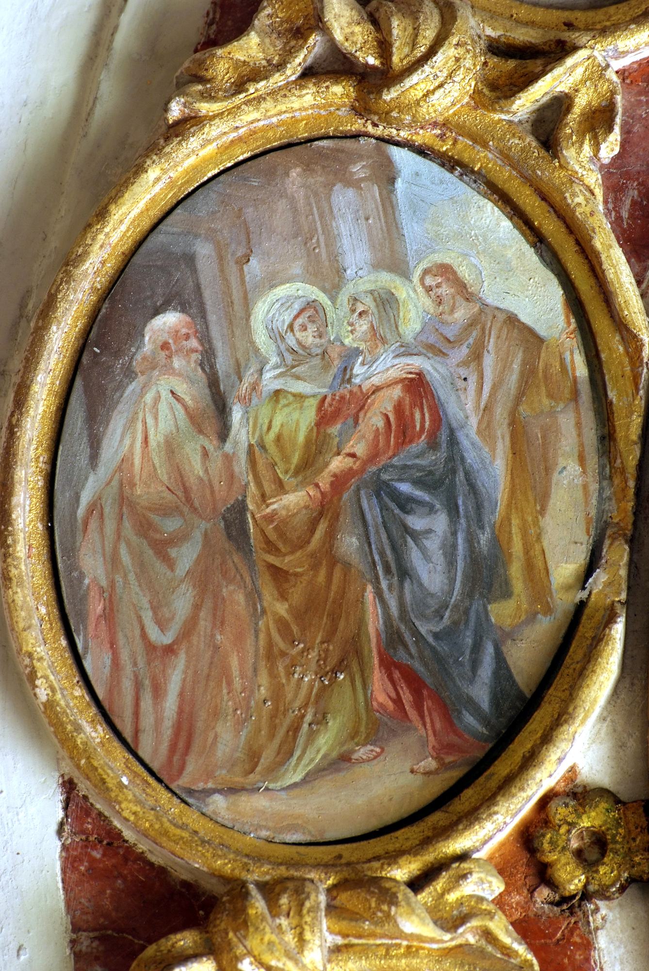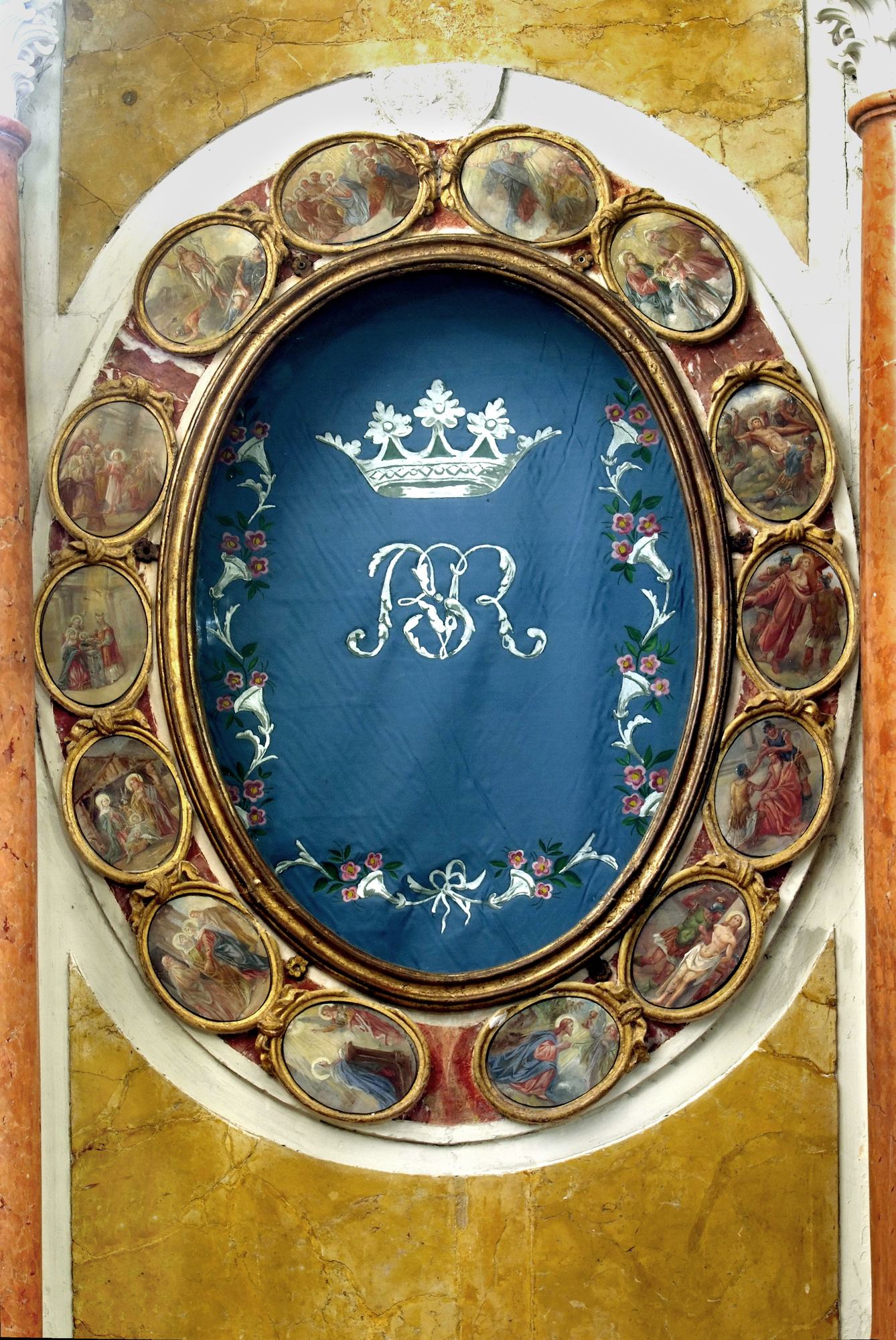 Le piccole opere rappresentano i Misteri del Rosario, suddivisi in Gaudiosi, Dolorosi e Gloriosi, ma non inseriti secondo questo ordine canonico. Partendo dal basso e proseguendo in una lettura in senso orario si possono riconoscere le scene dell’Annunciazione, Visitazione, Natività, Presentazione al Tempio. A seguire dovrebbero comparire quelli riferibili ai Misteri Dolorosi, ossia l’Orazione nell’orto, la Flagellazione, Cristo deriso, la salita al Calvario e la Crocifissione, che invece sono collocate sul lato opposto. Sulla parte alta sono invece posti erroneamente i dipinti riferibili ai Misteri Gloriosi: la Resurrezione, la Discesa dello Spirito Santo, l’Assunzione di Maria e la sua Incoronazione. L’errata posizione non è la sola anomalia, mancando infatti il medaglione con l’Ascensione, che avrebbe dovuto trovarsi tra di essi subito dopo la Resurrezione. È possibile che in occasione di alcune manutenzioni esso sia andato perduto, tuttavia lo spazio a disposizione non consente l’inserimento di un ulteriore medaglione, anche avvicinando tra loro quelli esistenti o annullando la separazione tra i precedenti, il che fa supporre che si tratti di un’originaria (o originale?) dimenticanza del pittore o di un maldestro riutilizzo da qualche altare di altra chiesa.