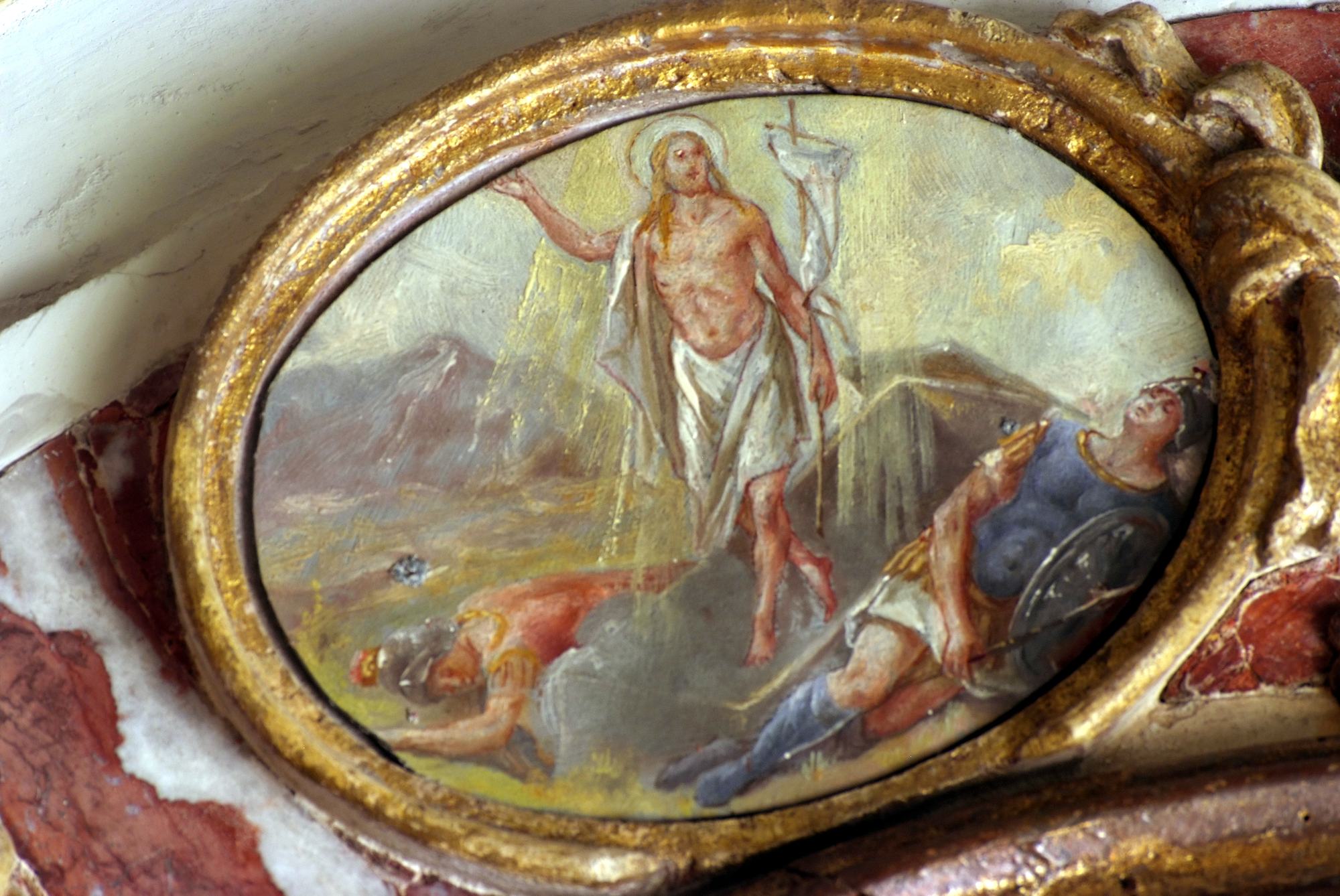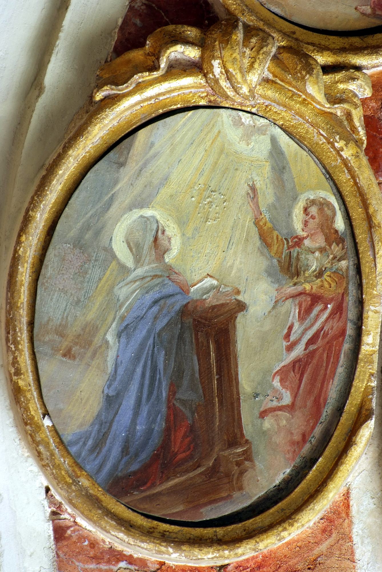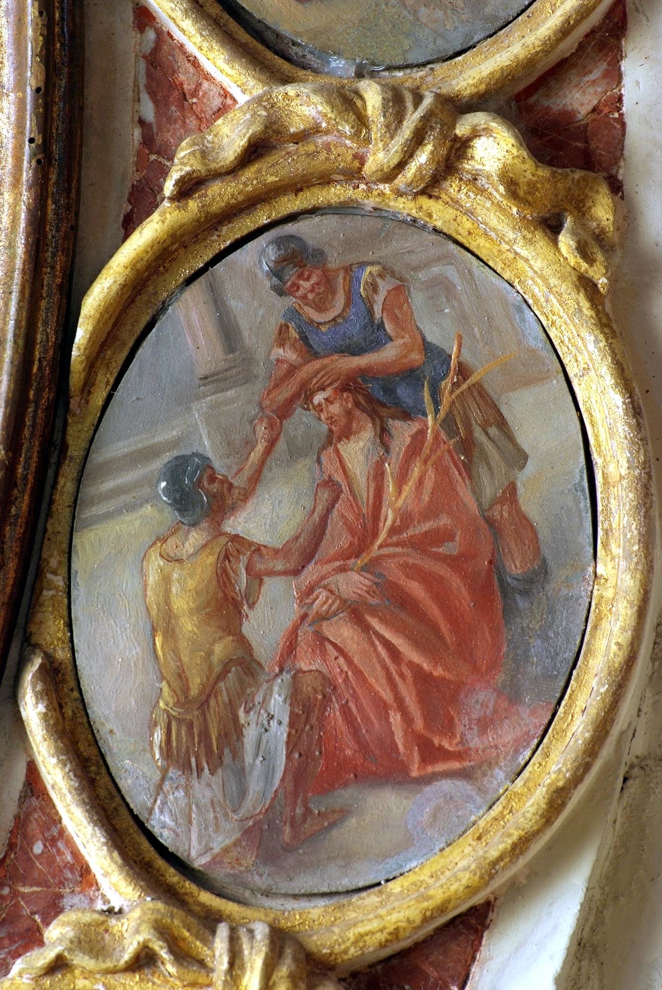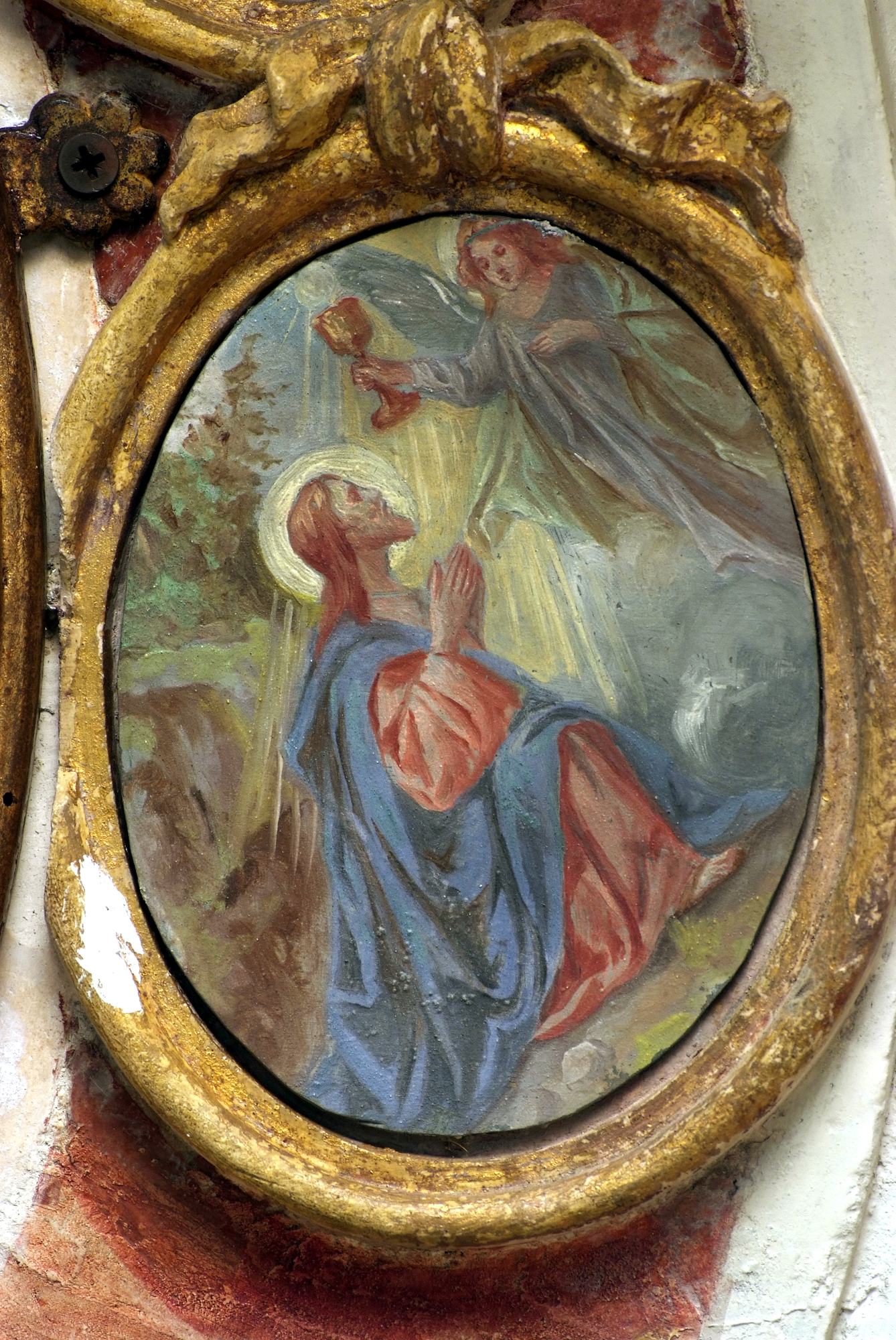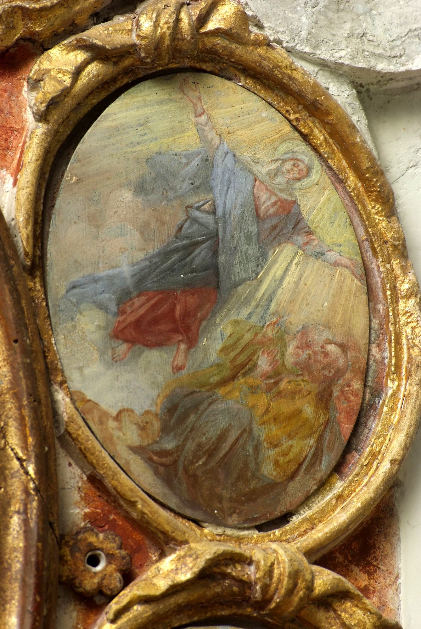 A coronamento della nicchia ovale corrono quattordici medaglioni realizzati a tempera su lamina metallica dal pittore Luigi Filipponi, il quale nel 1923 fu incaricato di rifare quelle decorazioni. Nelle note d’archivio si legge infatti che rimasero sotto i presenti dipinti quelli eseguiti su marmo che, evidentemente, sono quelli coevi dell’altare.