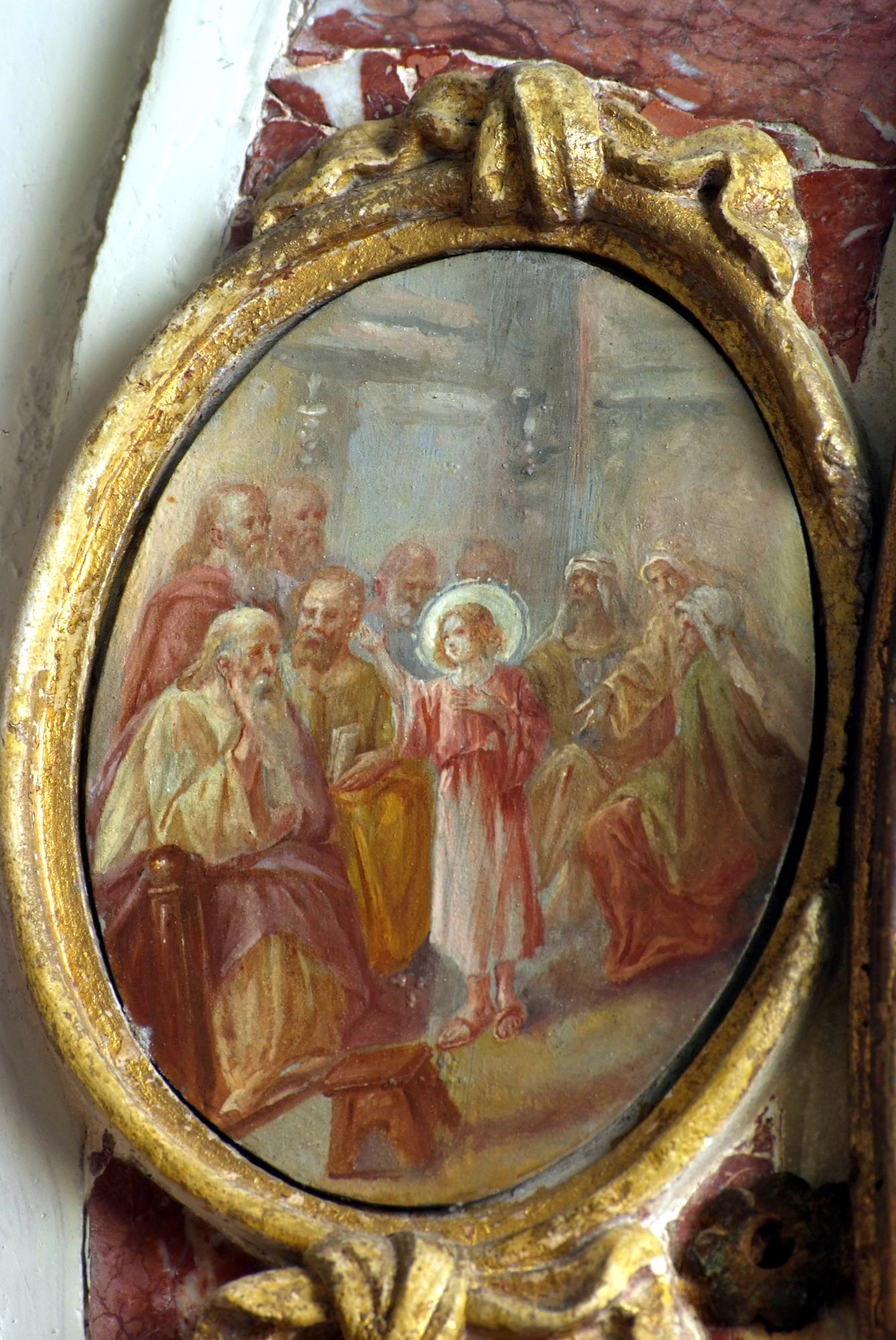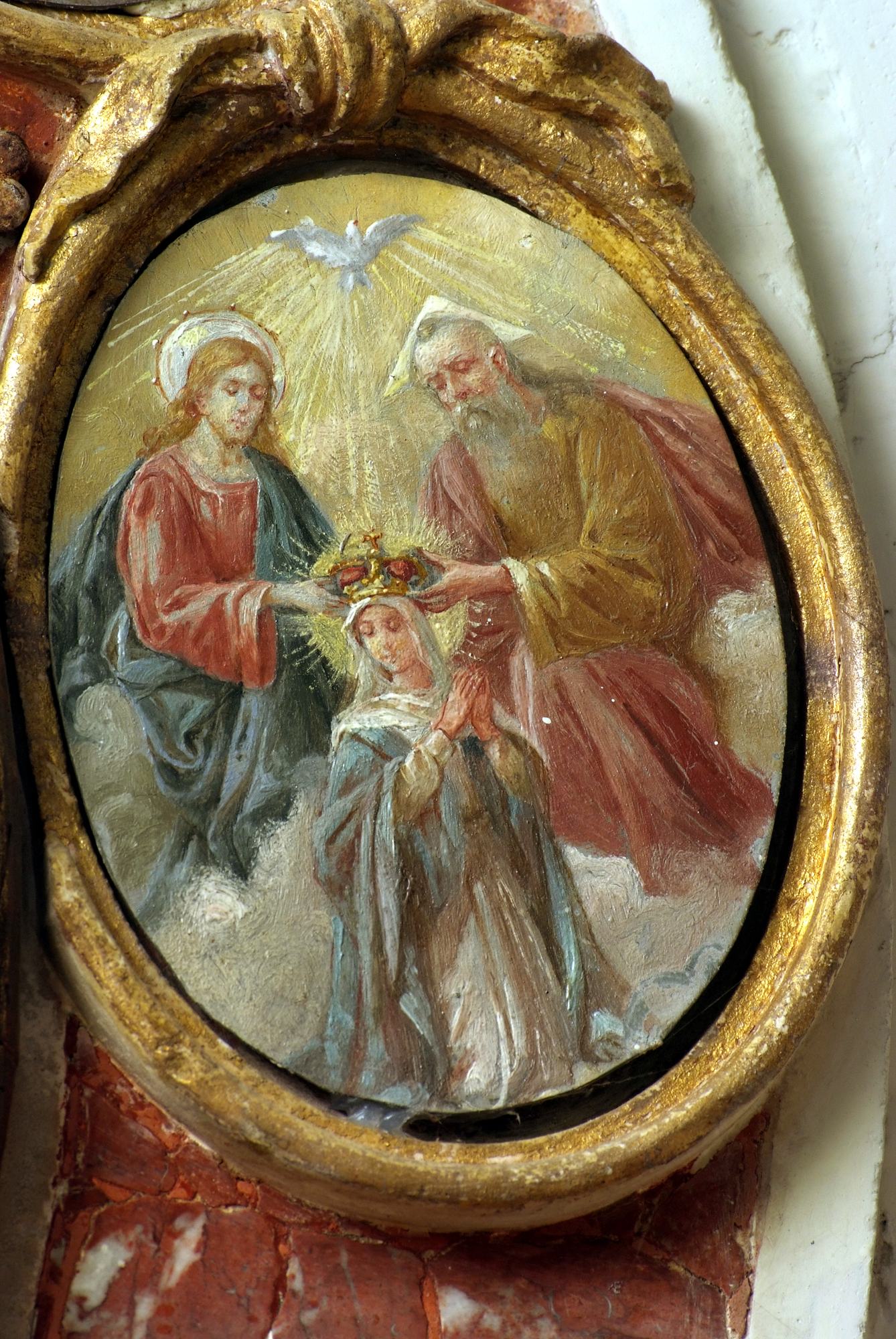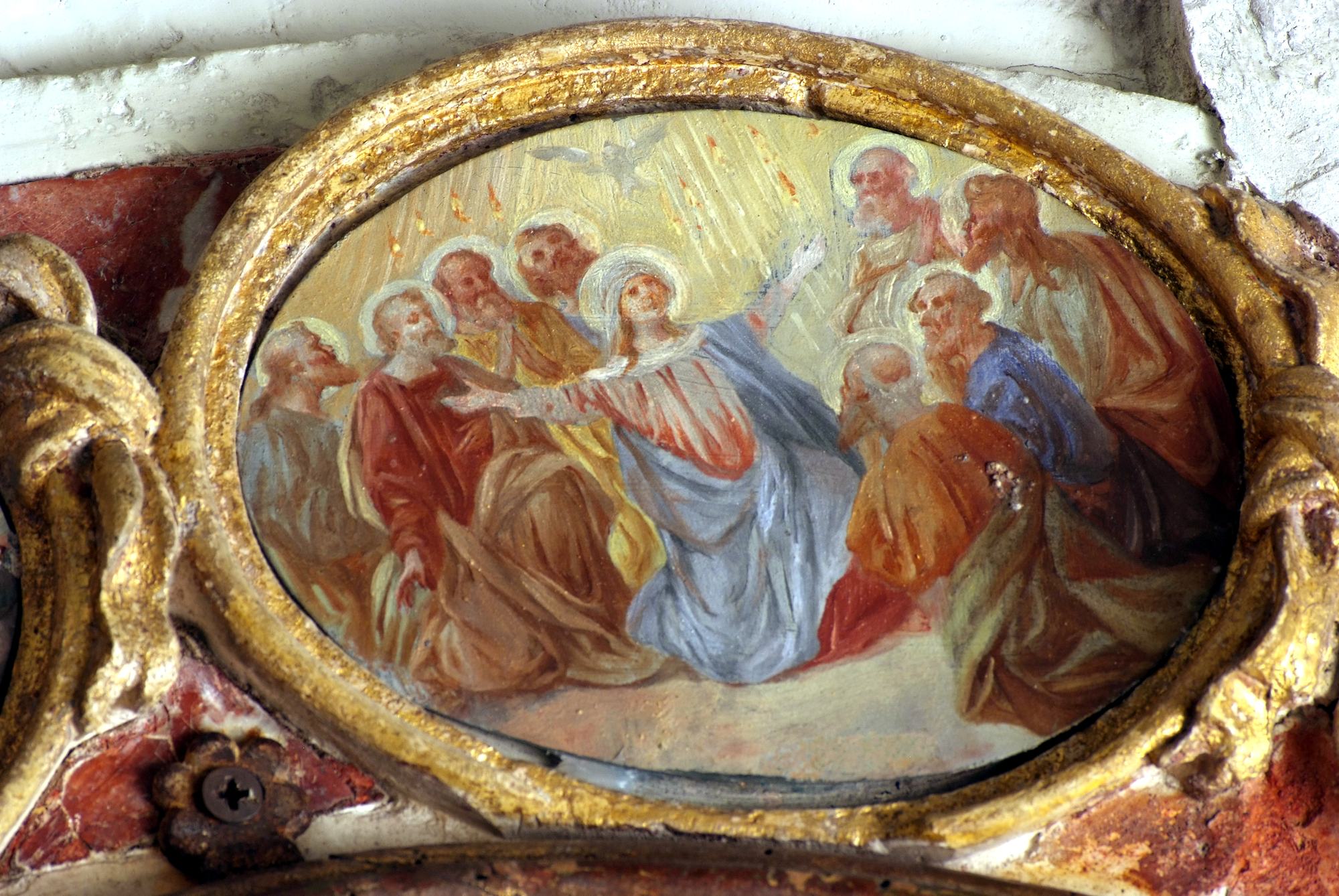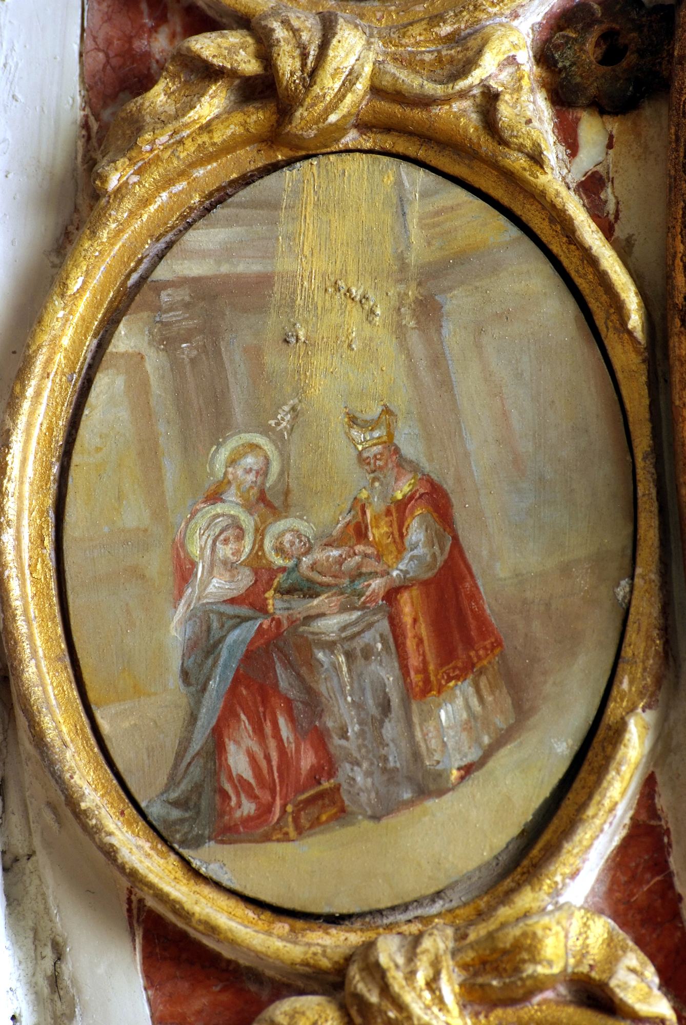 A coronamento della nicchia ovale corrono quattordici medaglioni realizzati a tempera su lamina metallica dal pittore Luigi Filipponi, il quale nel 1923 fu incaricato di rifare quelle decorazioni. Nelle note d’archivio si legge infatti che rimasero sotto i presenti dipinti quelli eseguiti su marmo che, evidentemente, sono quelli coevi dell’altare.