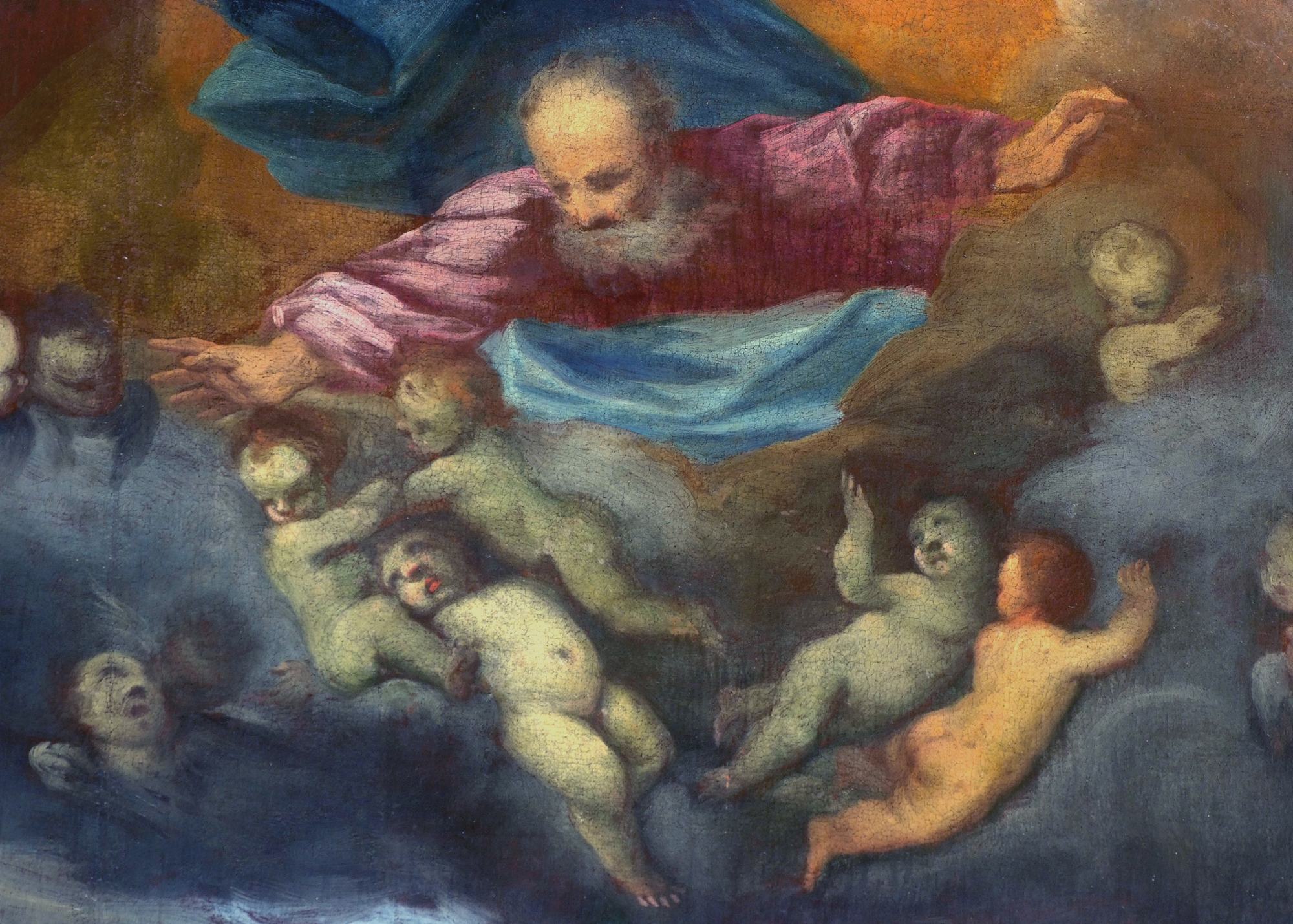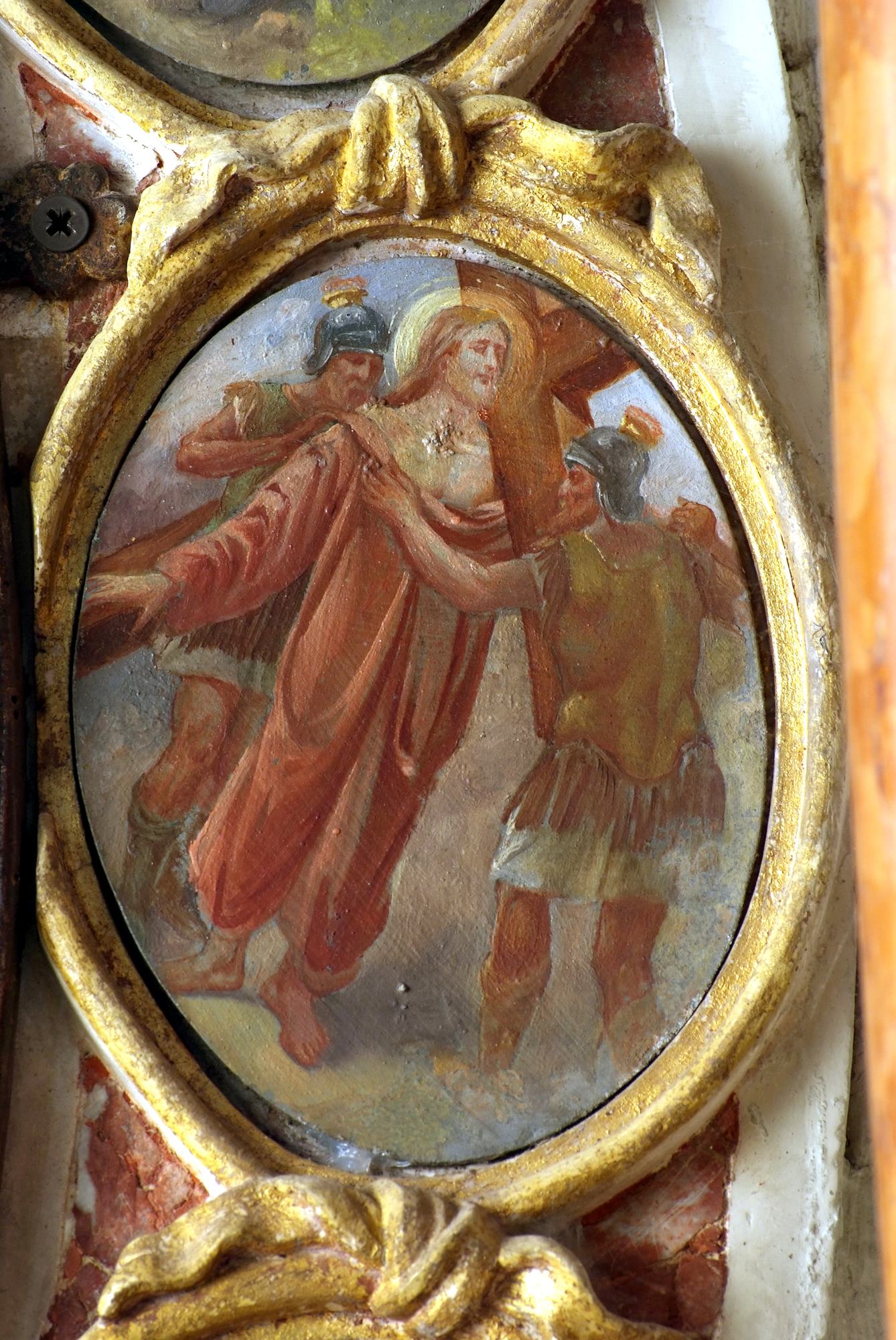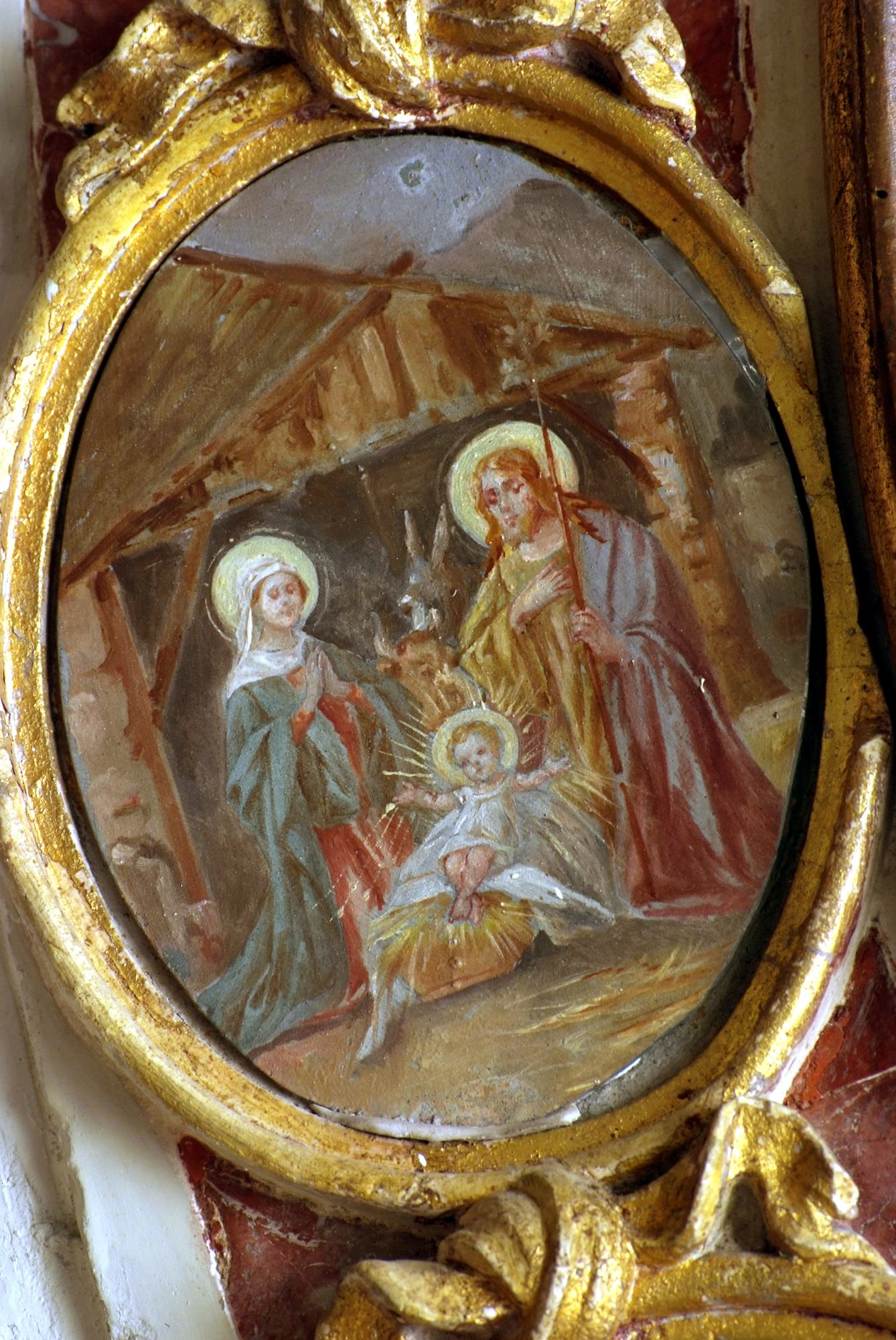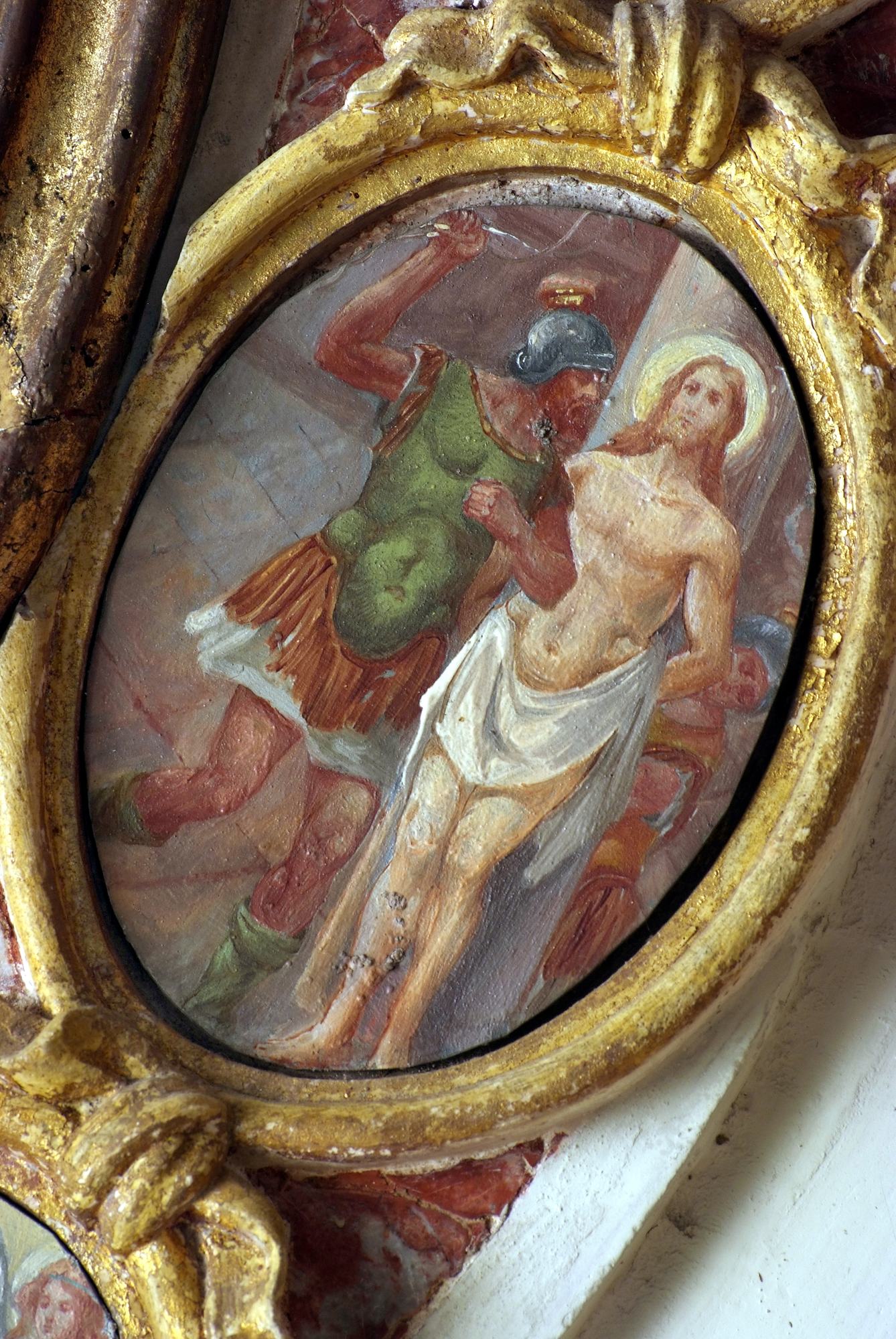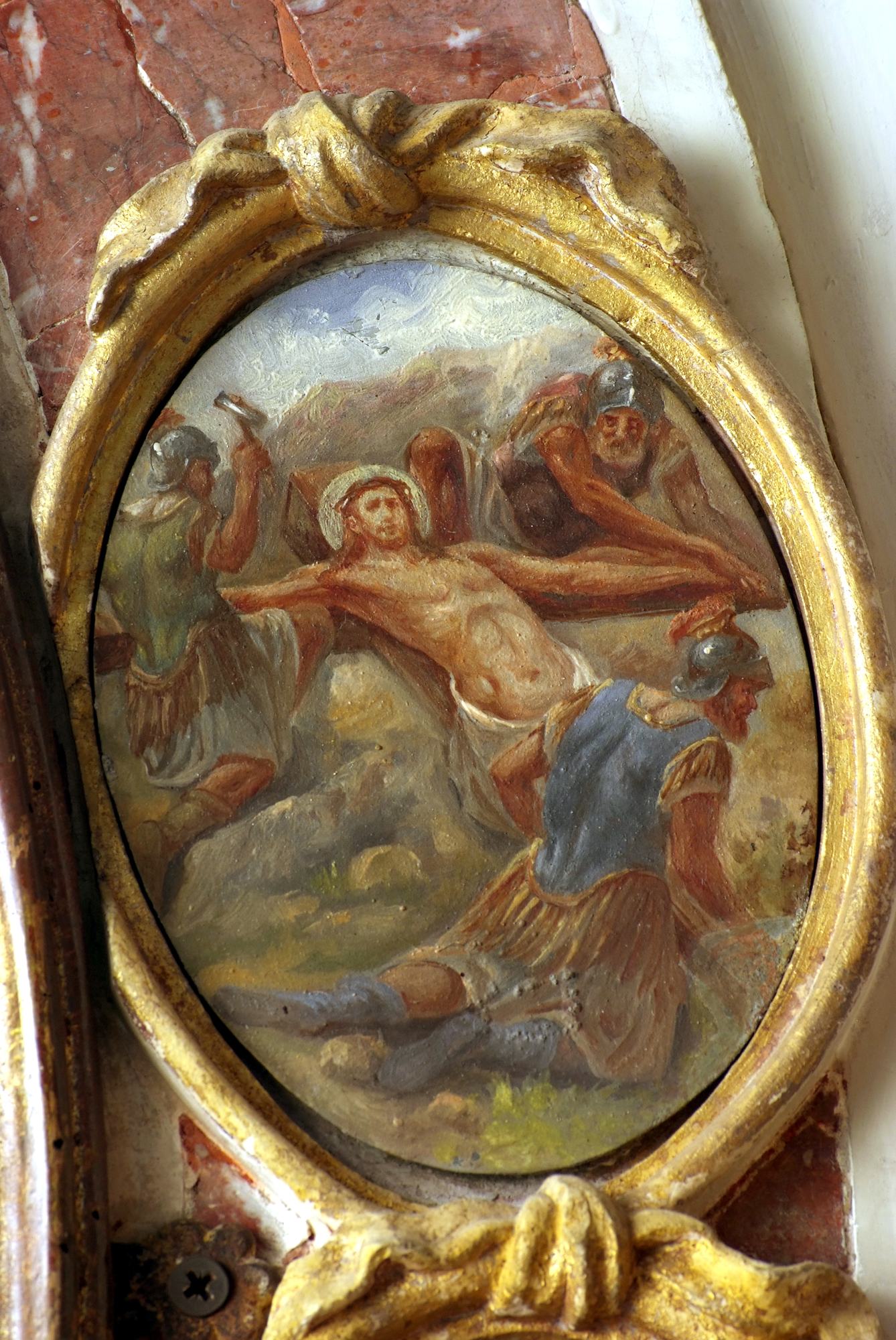 A coronamento della nicchia ovale corrono quattordici medaglioni realizzati a tempera su lamina metallica dal pittore Luigi Filipponi, il quale nel 1923 fu incaricato di rifare quelle decorazioni. Nelle note d’archivio si legge infatti che rimasero sotto i presenti dipinti quelli eseguiti su marmo che, evidentemente, sono quelli coevi dell’altare.