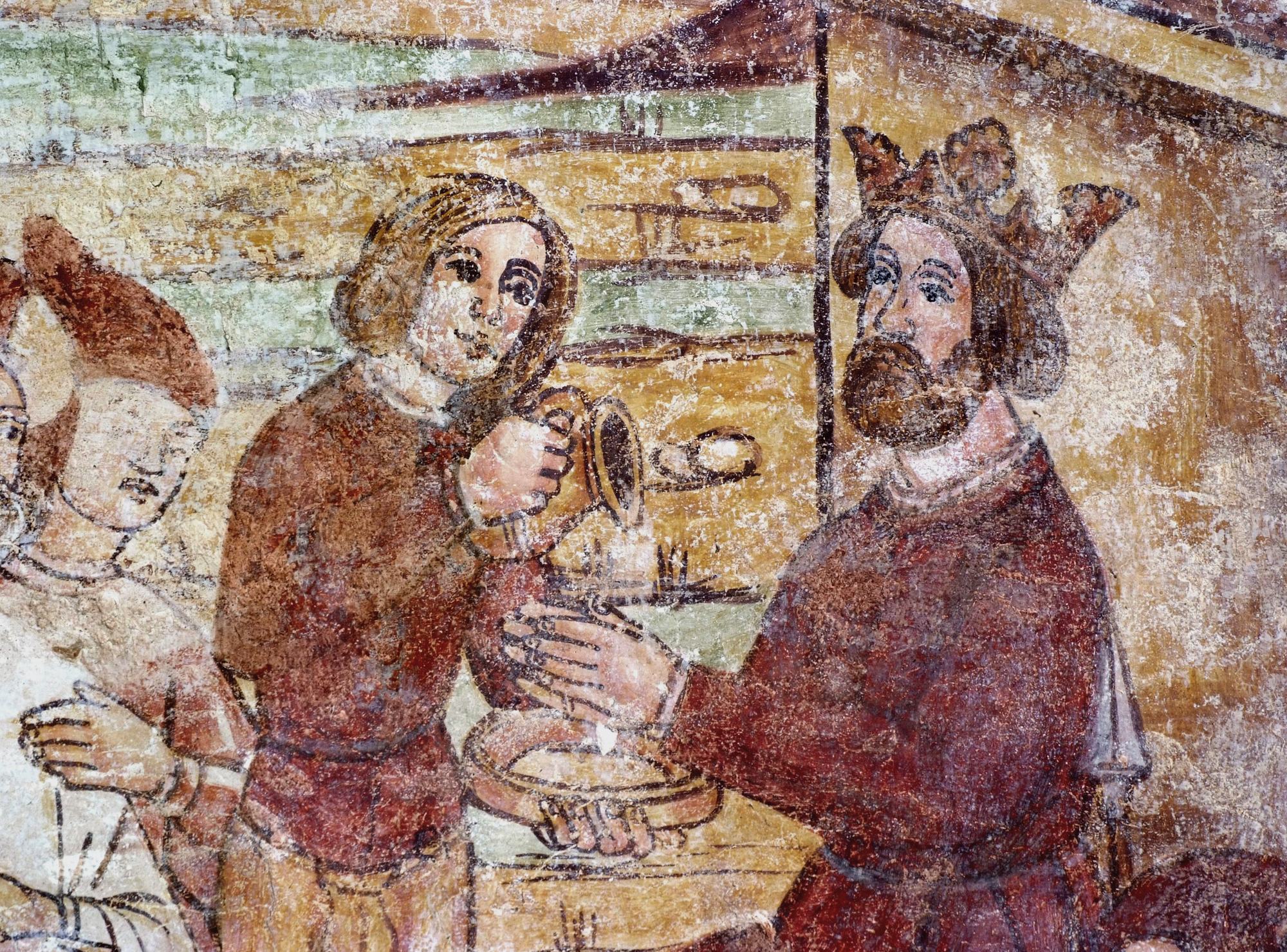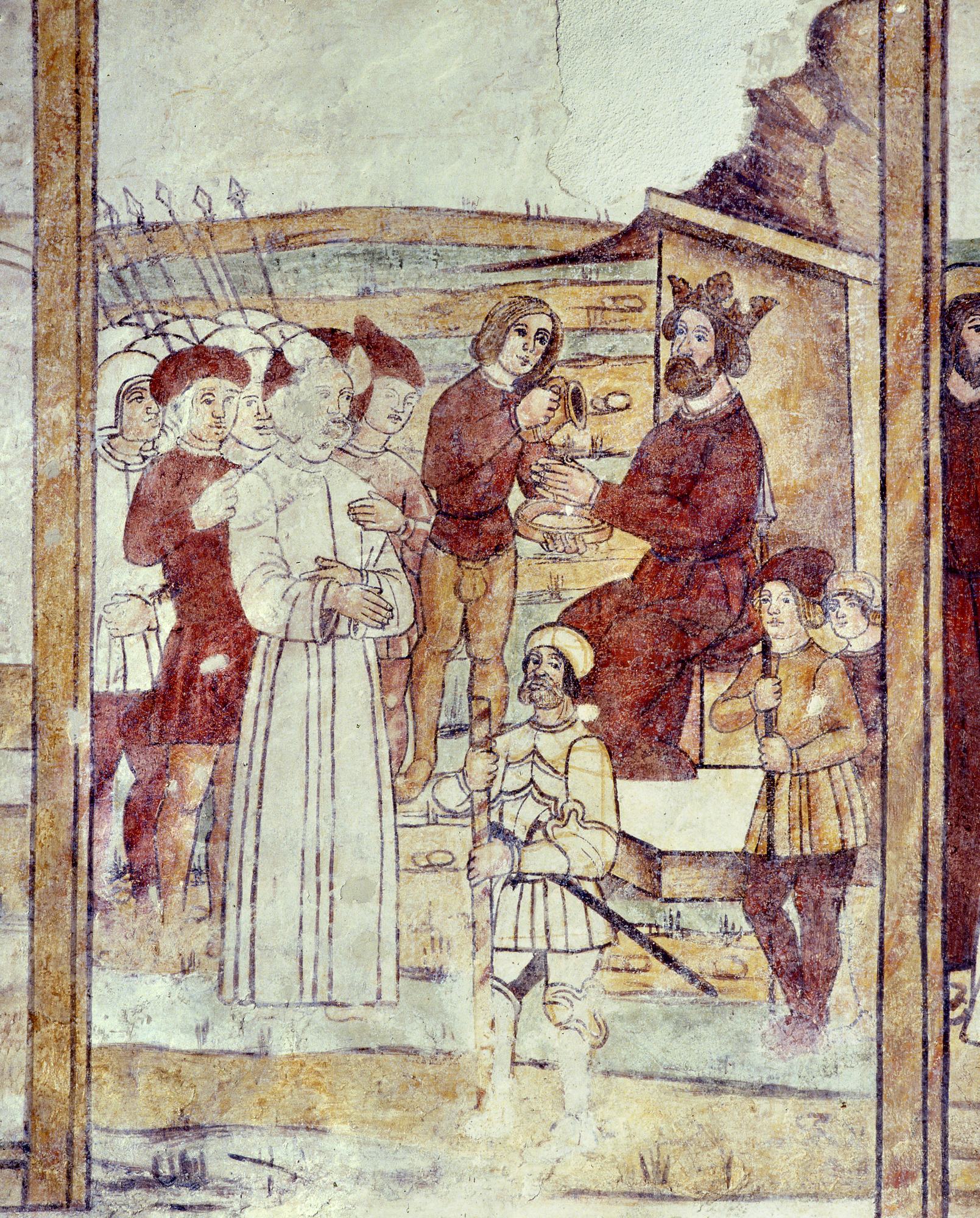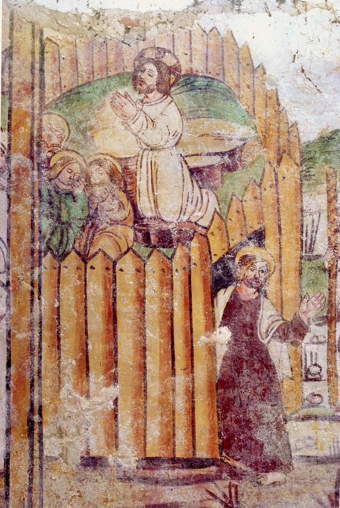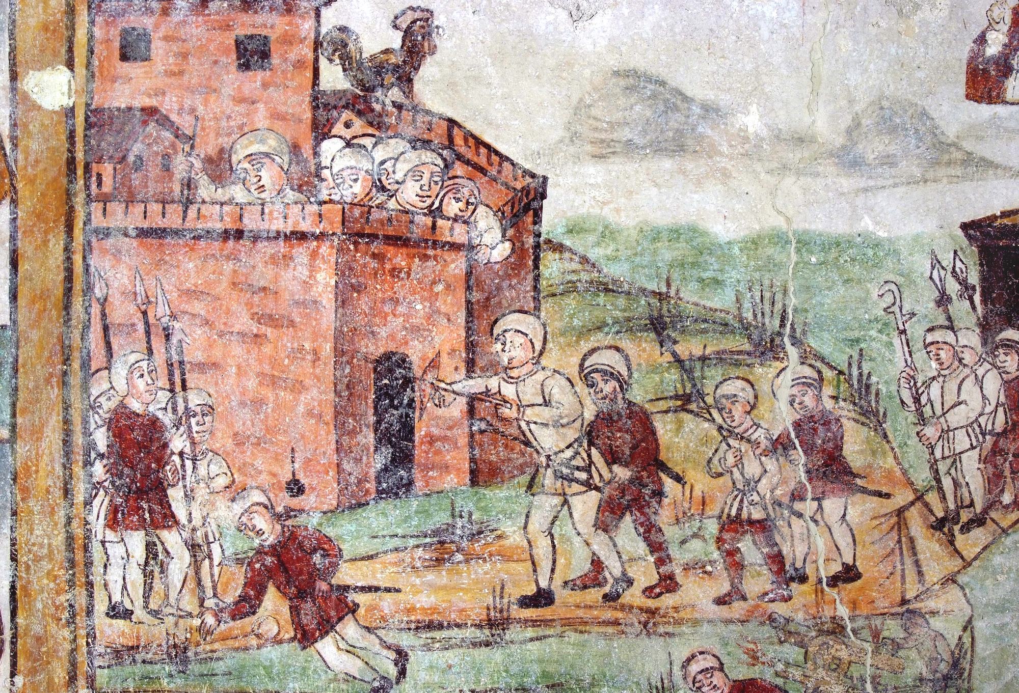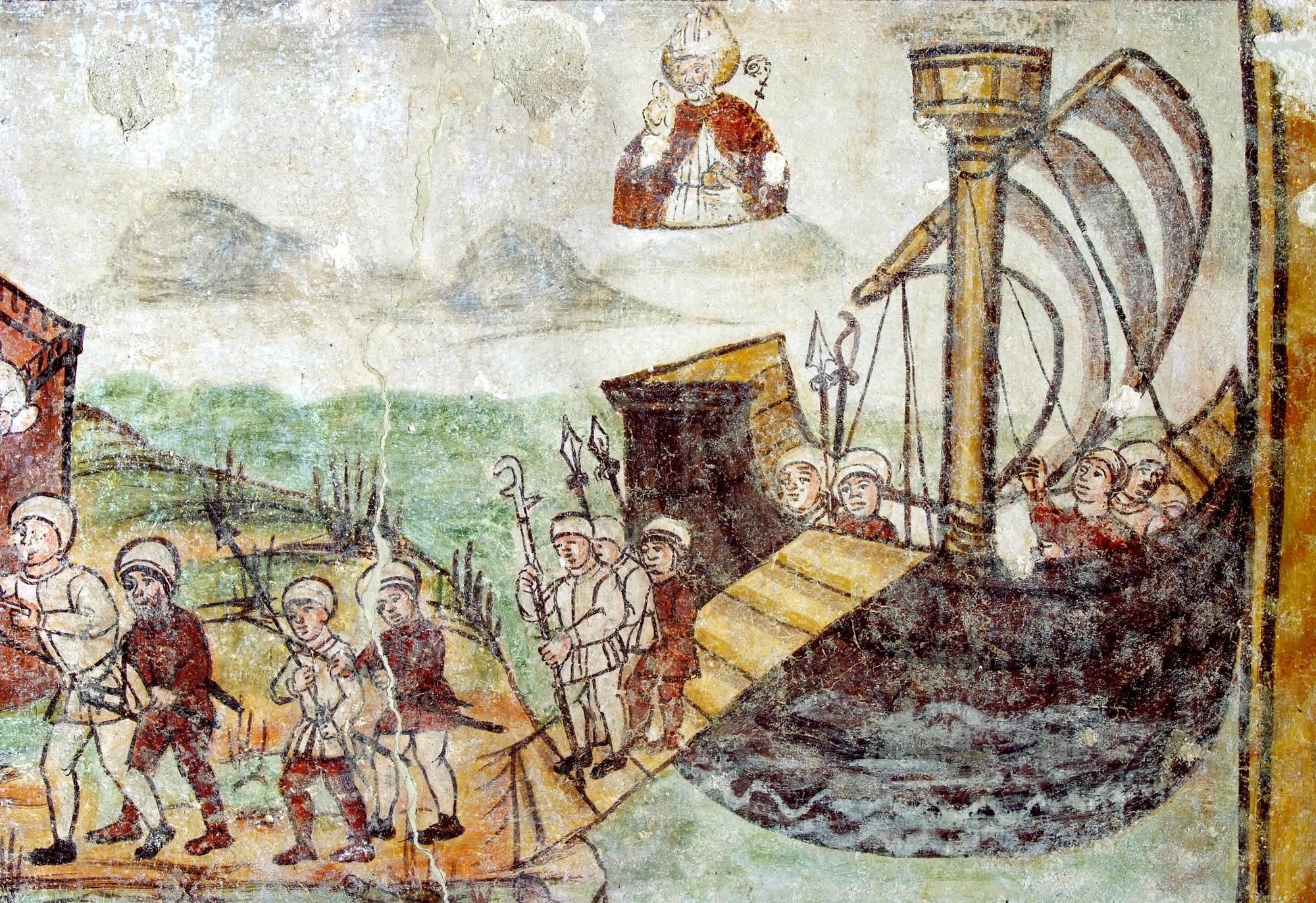 Chiesetta campestre di San Leonardo, affeschi parete destra, Miracolo di San Nicola, sec. XVI, Variano