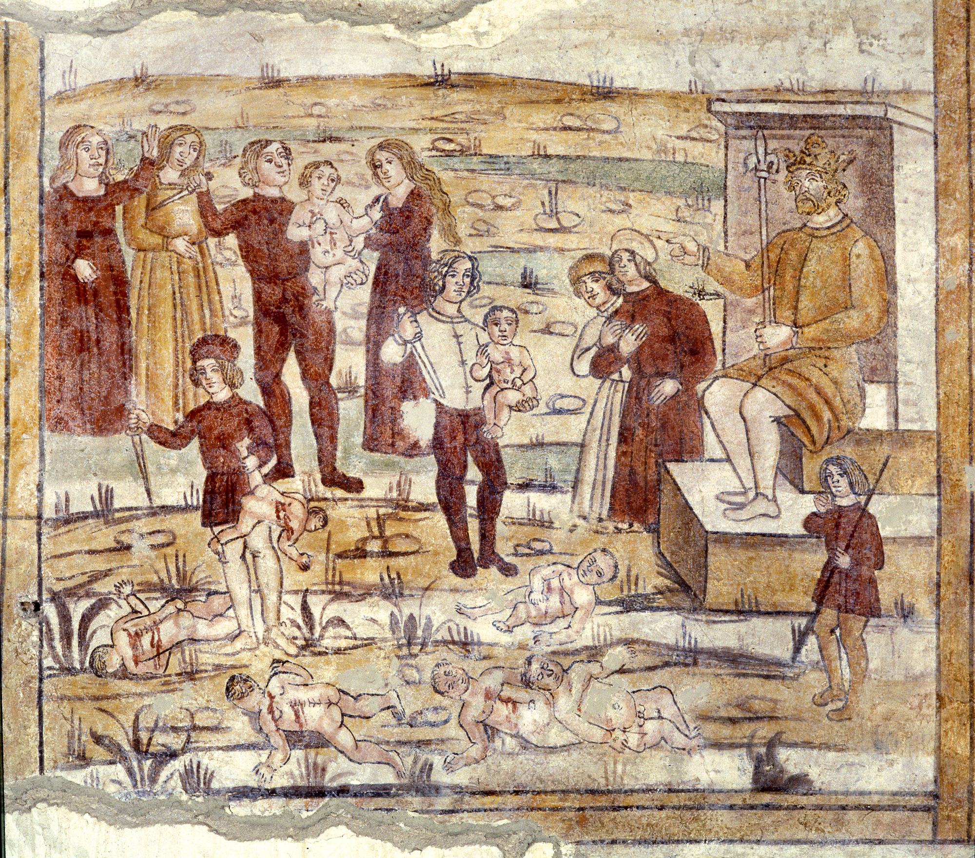 Sulla parte destra, leggendo le scene dall’ingresso verso il presbiterio e partendo dalla fascia superiore, sono dipinte l’Orazione nell’orto, la Cattura di Cristo e Cristo davanti a Pilato, scene evangeliche con una continuità narrativa, spezzata però dalla raffigurazione della Strage degli Innocenti, che non ha nulla a che fare con la successione cronologica dei fatti, ma che forse vuole qui rimandare ad un analogo sacrificio, sempre di un Innocente. Proseguendo si incontrano un Sant’Osvaldo e una Madonna in trono con Bambino affiancata da un santo, forse San Giacomo, e da San Leonardo.