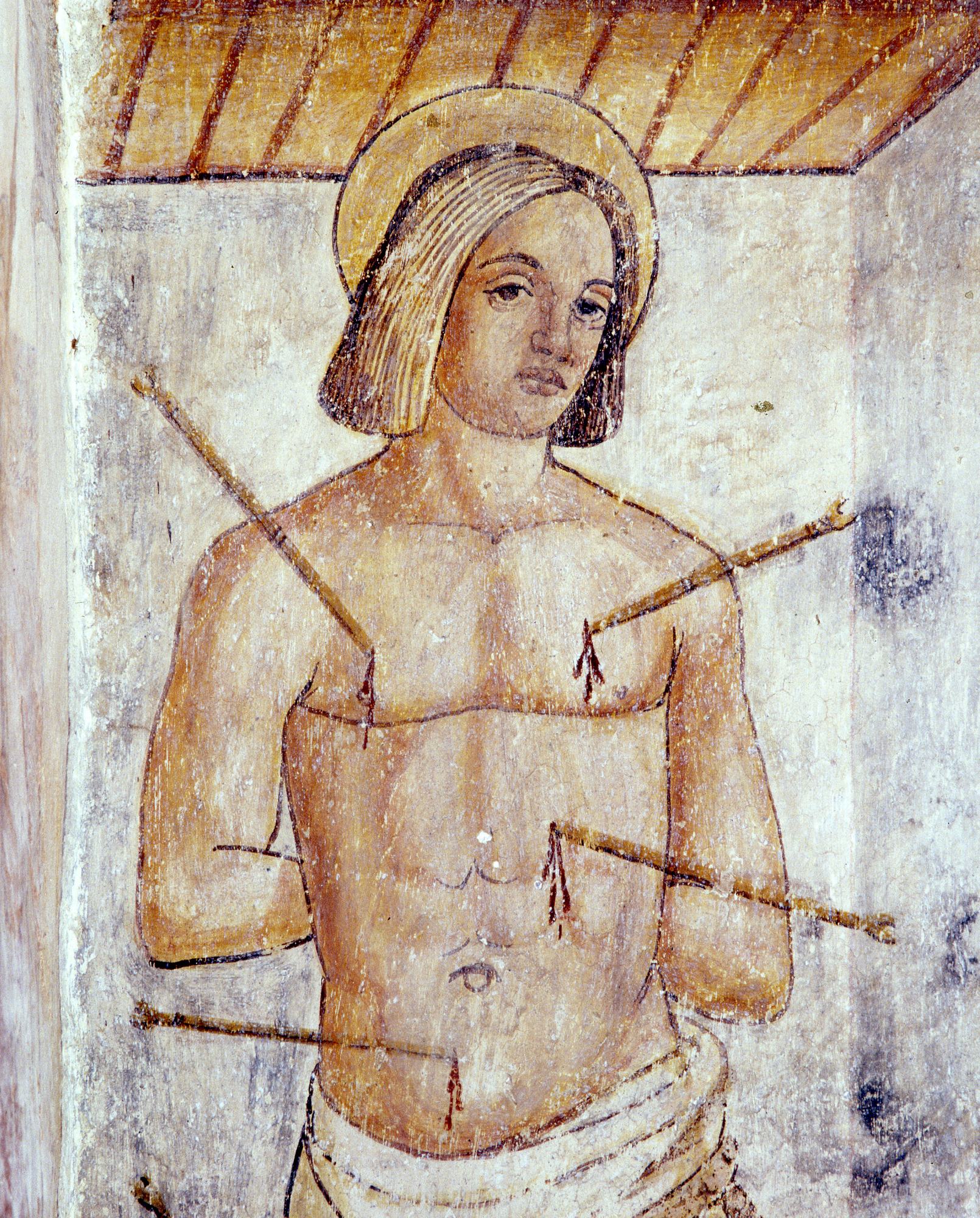Chiesetta campestre di San Leonardo, affeschi parete destra, Madonna in trono con Bambino tra i Santi Rocco e Sebastiano, a lato Sant'Agata e Santa Cristina, sec. XVI, Variano