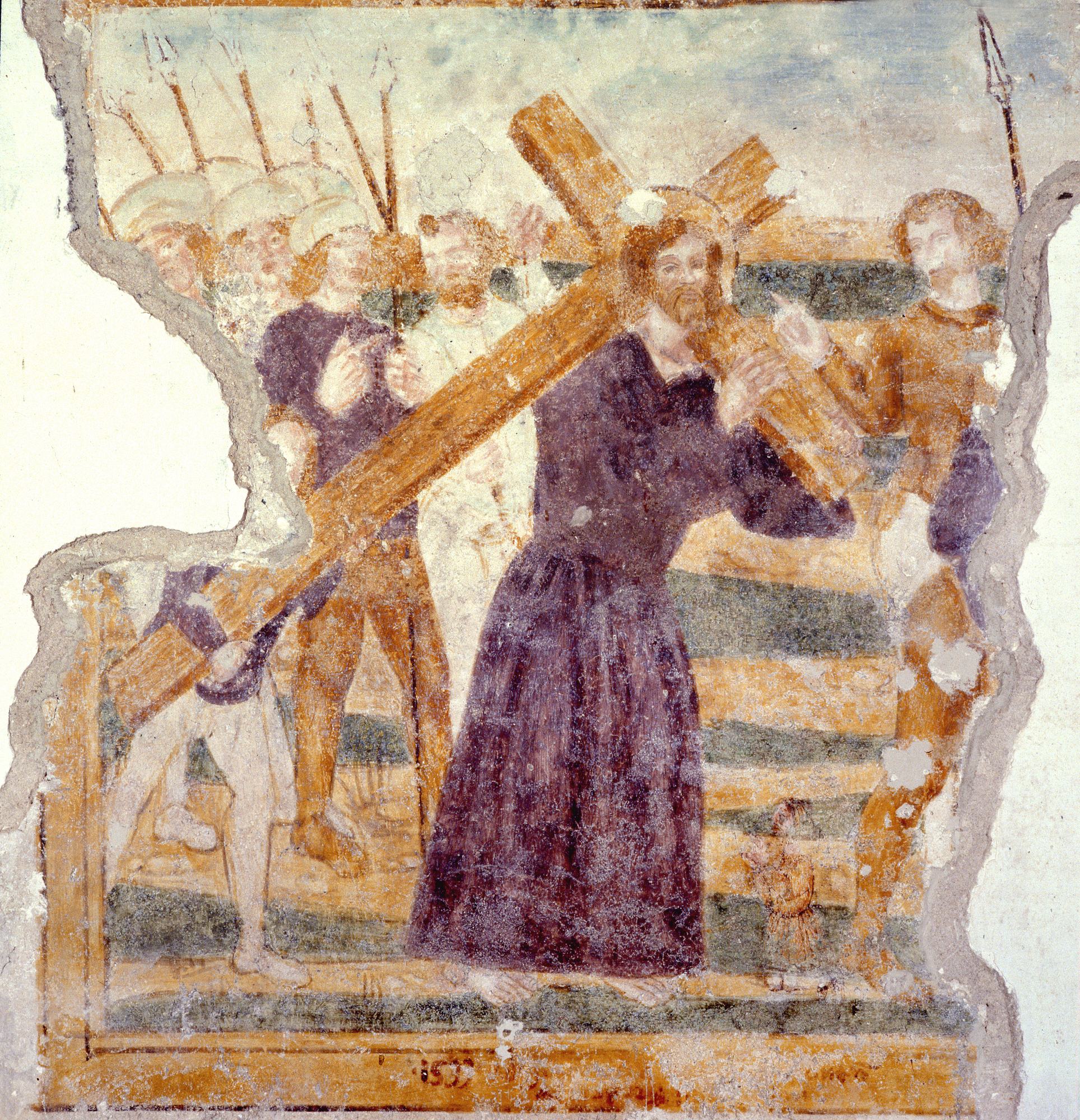 Scendendo si trova una Madonna tra i santi Bonifacio e Rocco e continuando sulla parte destra si vedono San Sebastiano e San Leonardo, poi una lacuna spezza il discorso pittorico che prosegue con la Salita al Calvario, dopo un’ulteriore interruzione dovuta all’inserimento di una porta, si vede l’immagine mariana tra i santi ritenuti protettori dalla peste: San Rocco e San Sebastiano.