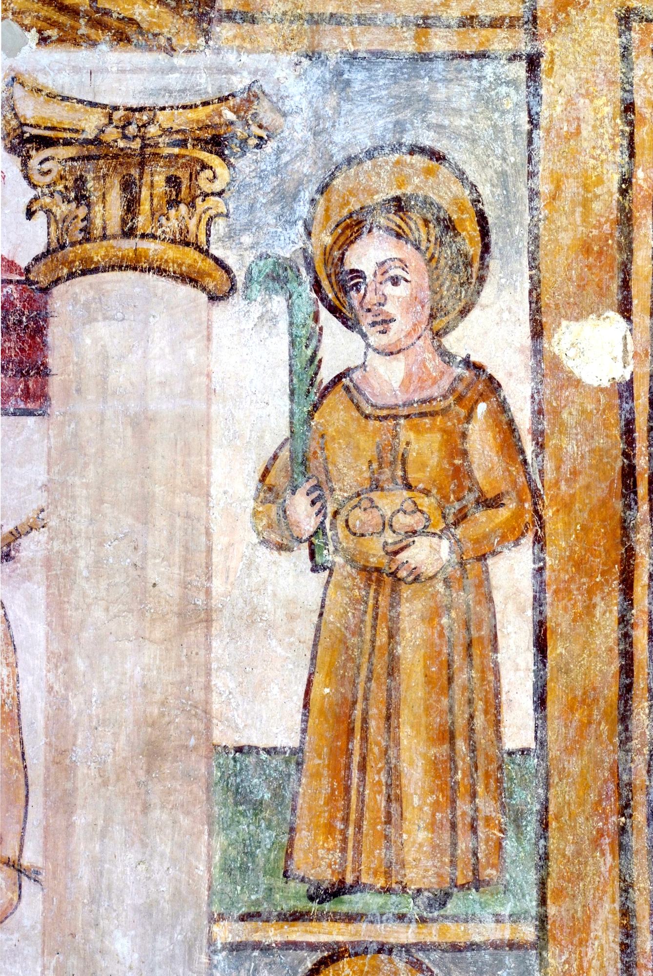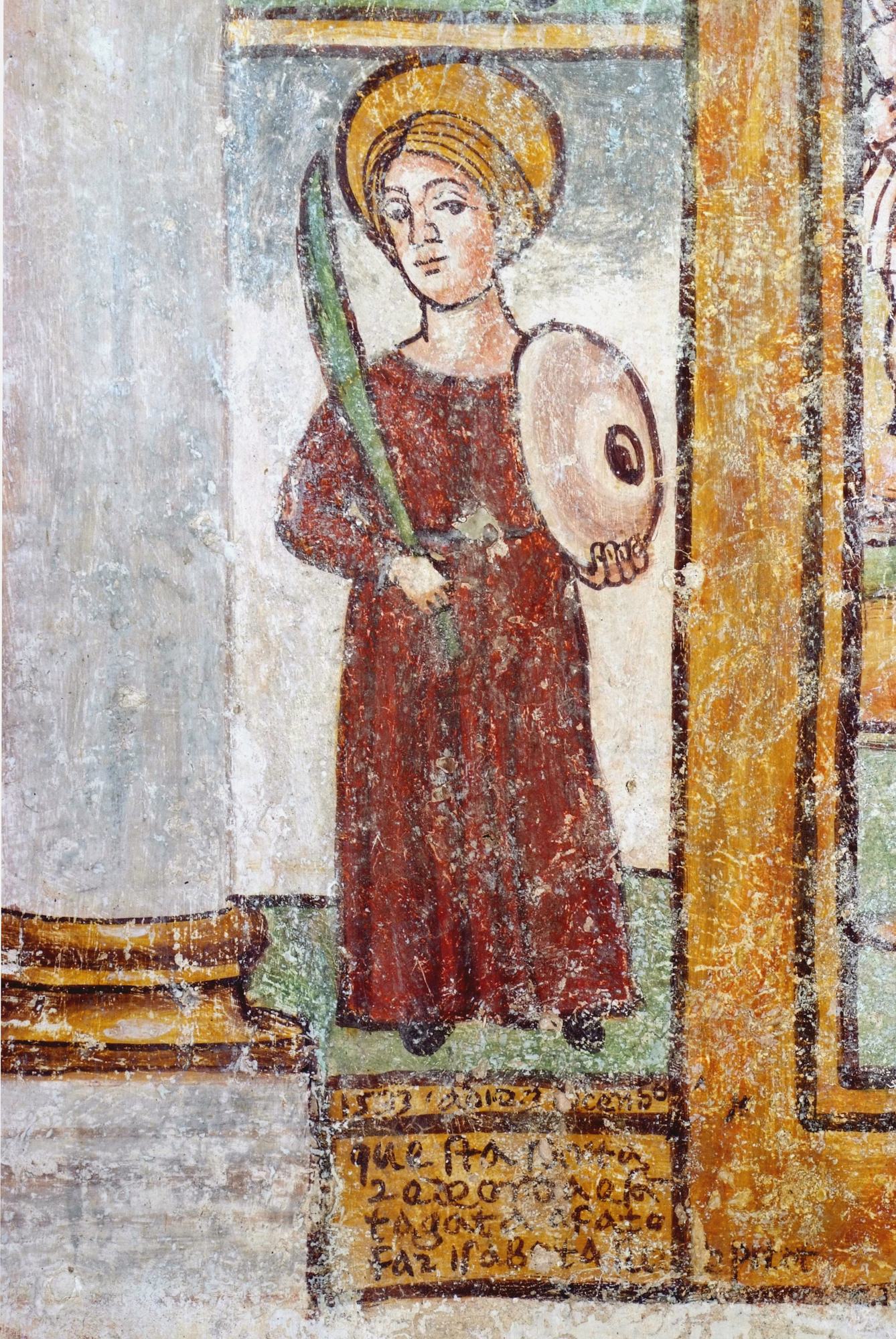 È invece un diversa mano quella che firma i successivi tre riquadri in cui sono collocati Sant’Agata e Santa Cristina, il Miracolo di san Nicola e un San Leonardo, che per raffinatezza dei tratti si discosta dalle figure vicine. Il riquadro in cui è raffigurato il Miracolo di san Nicola narra di uno sbarco di soldati armati di lance, mossi all’assalto di una fortezza e protetti nell’impresa da un santo vescovo. La scena è sempre stata letta come raffigurazione del miracolo del salvataggio dei naufraghi ad opera di san Nicola. Vero è che, più che marinai, quelli a cui il santo in questo caso presta soccorso sono dei soldati, ma essendo la vicenda già alquanto lacunosa sul piano storico, non deve sorprendere se la traduzione in pittura non risulta sempre del tutto fedele.
