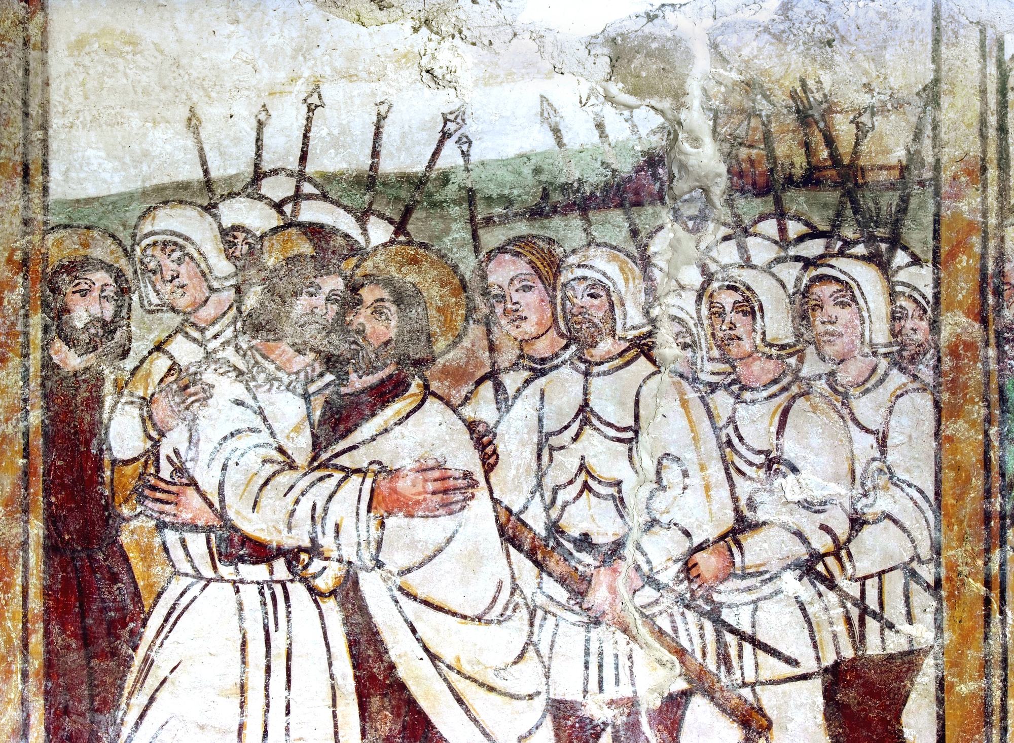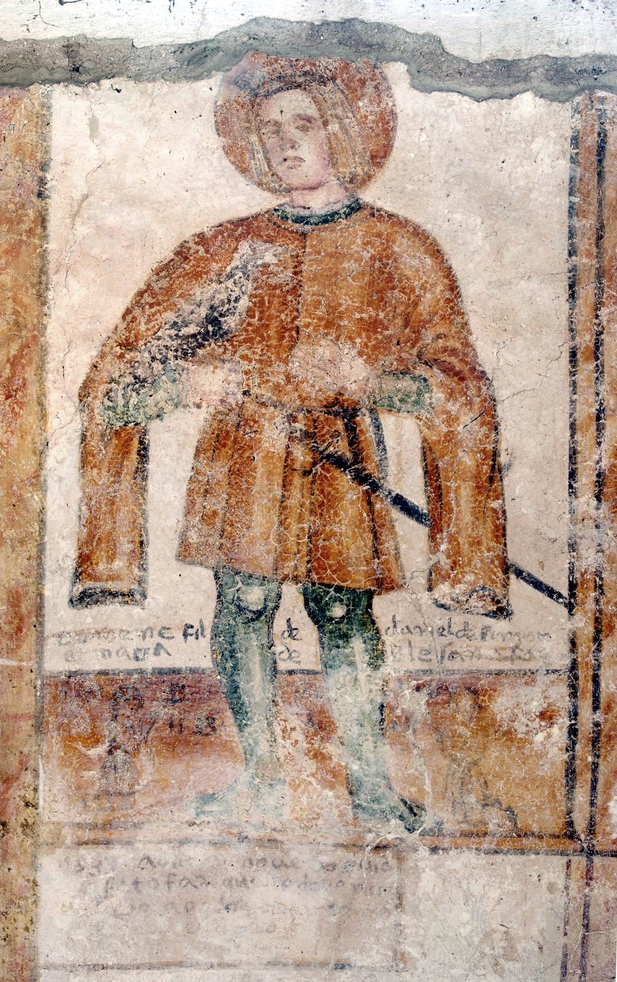 La lettura dei dipinti, interrotta da una consistente lacuna, si basa su una scena in cui due cavalieri recano omaggio a Maria o chiedono il suo perdono. Il caratteristico abbigliamento di uno di questi porta a identificarlo come protagonista anche della scena a fianco, sulla parte inferiore dell’arco trionfale. Una delle letture iconografiche fatte in occasione degli studi su questi affreschi riconosce in costui San Giuliano l’Ospitaliere.