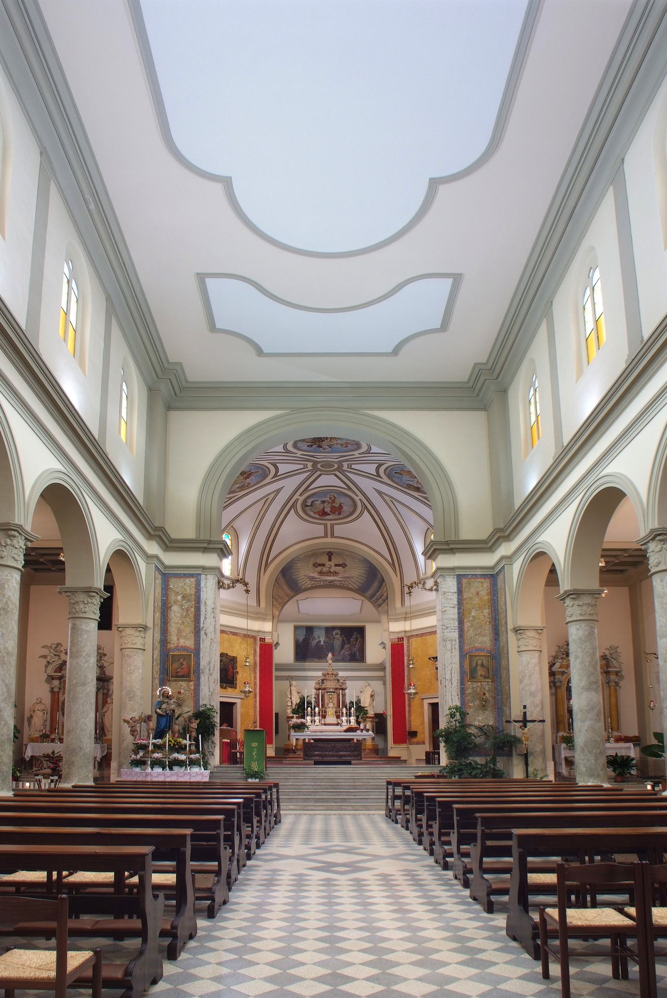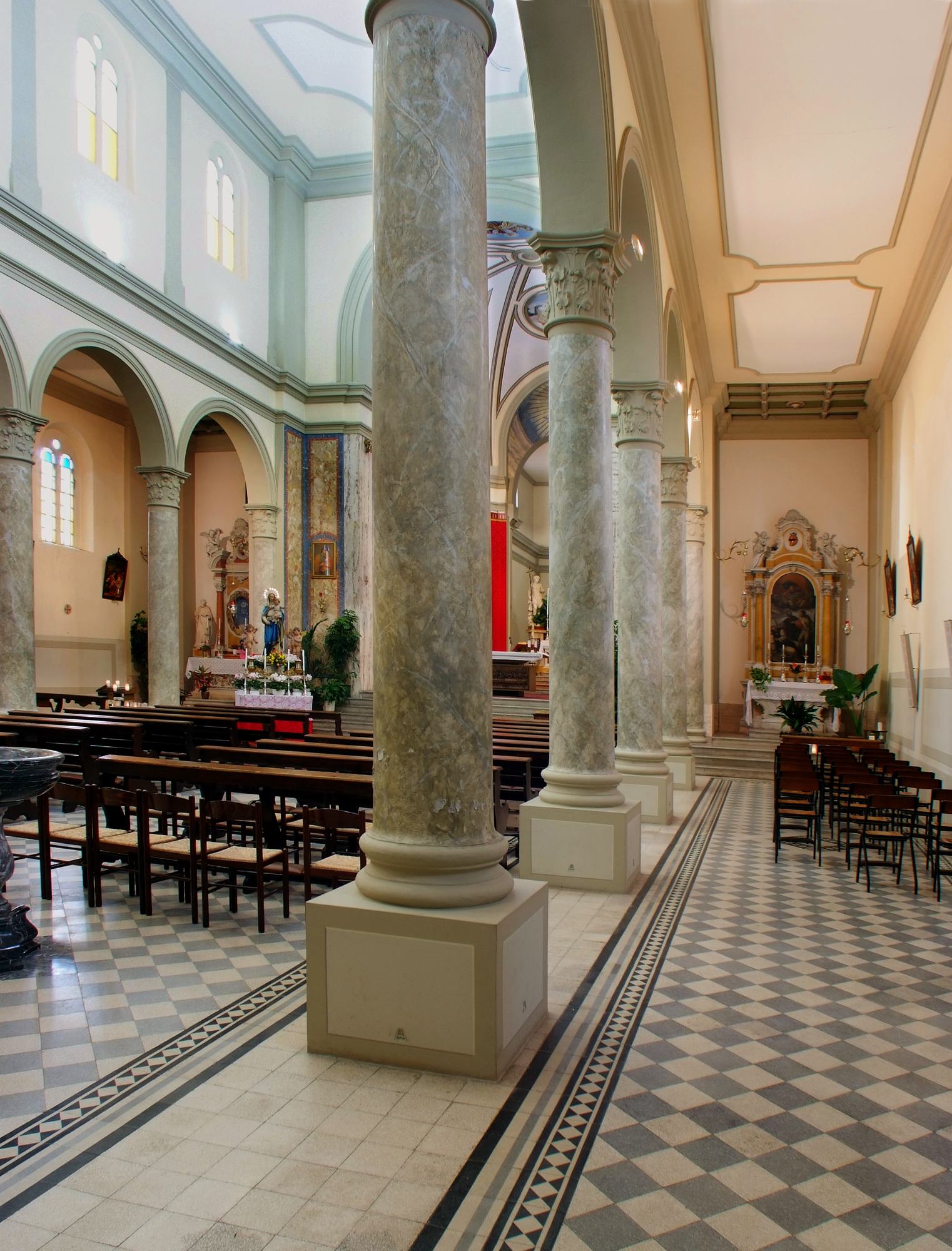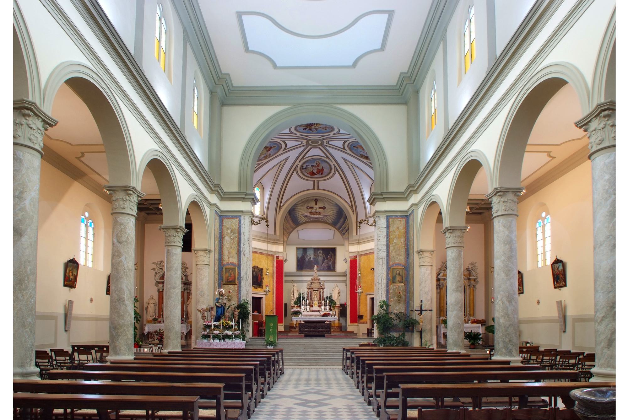 Quella centrale corre verso il presbiterio che, sopraelevato grazie a un’elegante gradinata, accoglie la mensa eucaristica con paliotto raffigurante l’Ultima cena (della seconda metà secolo XX).