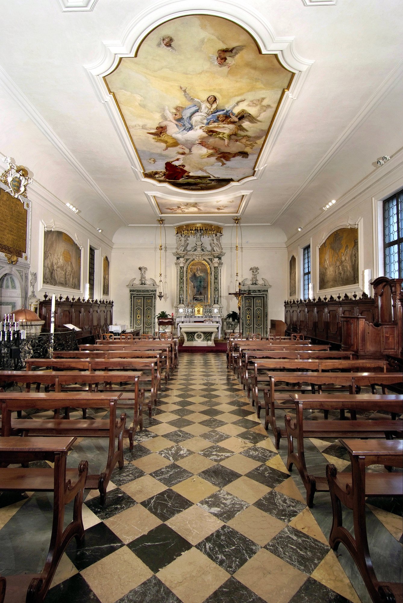 L’interno si presenta come una grande aula rettangolare dal soffitto piuttosto basso, con unico altare appoggiato alla parete di fondo nella quale si aprono due porticine che immettono alla sacrestia. A decorarlo venne chiamato il pittore Giambattista Tiepolo (1696-1770), che nel 1759 dipinse la pala d’altare con l’Immacolata e affrescò il soffitto con l’Assunta nel riquadro centrale e Gloria di angeli nei due minori; le pareti vennero nello stesso anno dipinte a chiaroscuro su fondo oro dal figlio Giandomenico Tiepolo (1726-1804) con otto scene aventi come protagonisti, in positivo o in negativo, i fanciulli. Esempi di punizioni terribili, di eroici martìri, insieme a momenti di affettuosa domestica intimità.