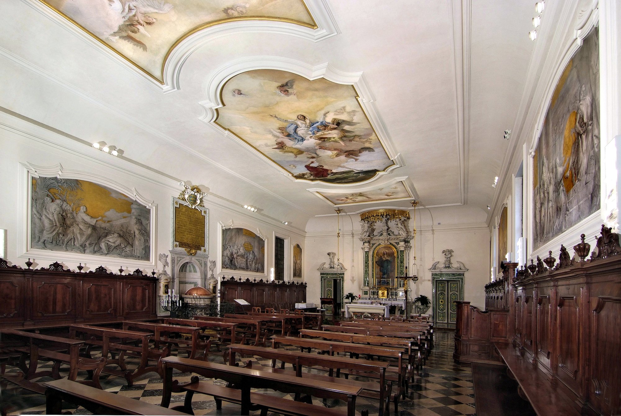 Al di sotto degli affreschi di Giandomenico corrono gli stalli lignei del “marangone” Maestro Bortolo, al quale spettano gli schienali e le sedute in mogano, i pilastri, i vasi intagliati e la cattedra, oltre a tutti gli altri lavori di falegnameria presenti. Tutti i mobili furono eseguiti dalla sua bottega e le porte furono infine dipinte ad olio dai pittori Girolamo Ronzone e Michele Pitton.