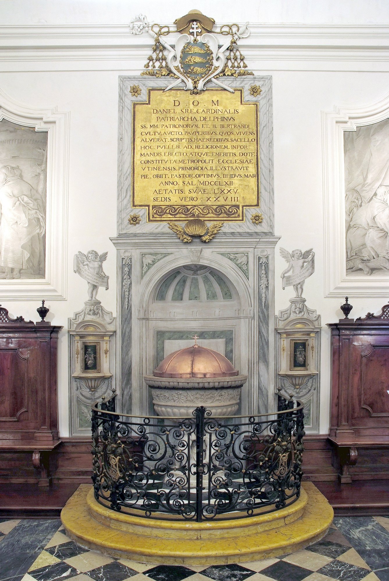 La ringhiera in ferro battuto dai gradevoli motivi ornamentali, eseguita nel 1923 da Alberto Calligaris (1880-1960), delimita lo spazio del sacro fonte battesimale. L’imponente epigrafe posta al di sopra della nicchia fu collocata dai canonici a ricordo della lodevole impresa attuata dal cardinale Daniele Delfino, il cui stemma compare in cima.