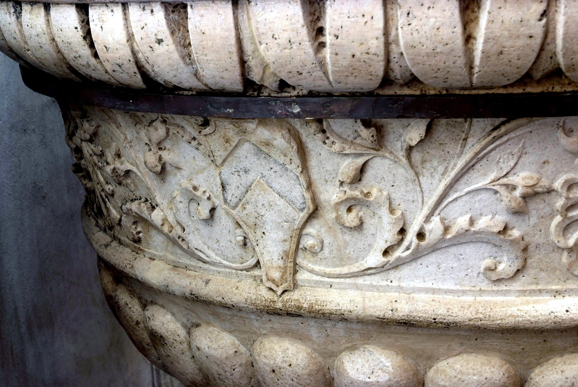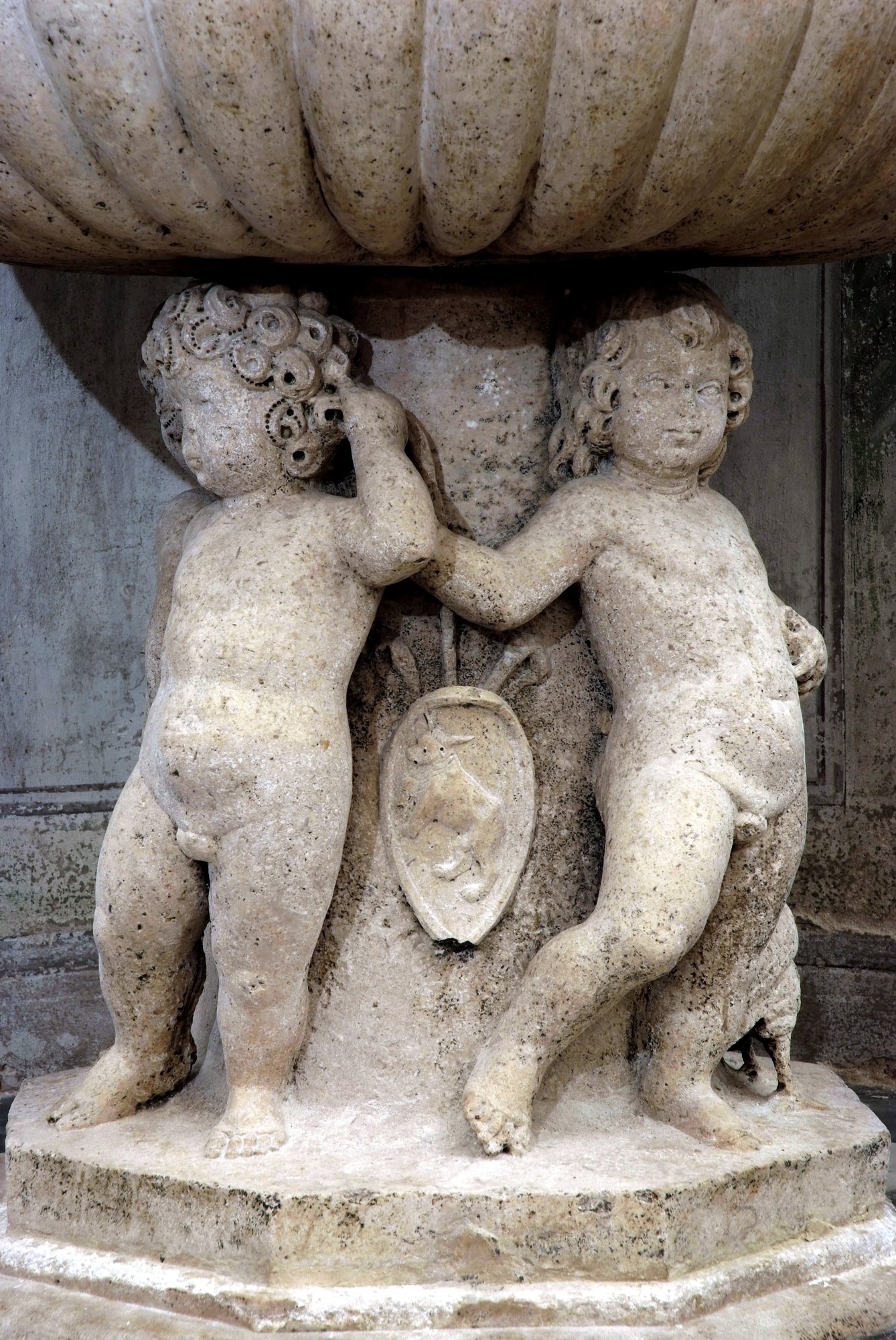 Tra i putti del battistero della Purità sono disposti, alternativamente, lo stemma della famiglia Sbroiavacca, quello della casata Del Torso, un motivo decorativo con festone di frutta e un’aquila, tra i racemi del bordo, lo stemma della città di Udine.