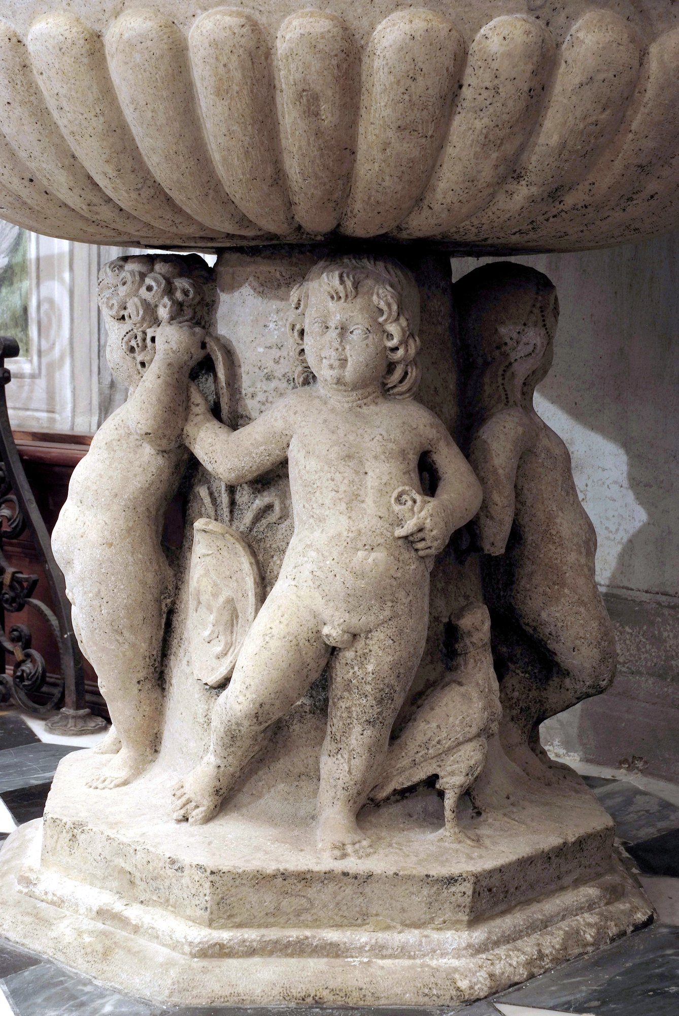 Il fonte battesimale si caratterizza, oltre che per il catino, finemente forgiato a baccellatura e cinto superiormente da una fascia a decoro classico, per il girotondo di eleganti, paffuti putti addossati al fusto, piacevole motivo già presente nei fonti veneziani di San Giovanni in Bragora e del duomo di Sebenico, nell’acquasantiera di “maistro Zorzi tagliapiera”a Spilimbergo e da Udine poi diffuso, ad opera soprattutto di lapicidi lombardi, in numerose località friulane, da Meduno a Travesio a Beano, da Rorai Grande a Torre di Pordenone, da San Daniele a Santa Margherita del Gruagno, Barbeano, Mortegliano, Rivignano, Flambro, Coseano, Clauiano, Maniago eccetera.