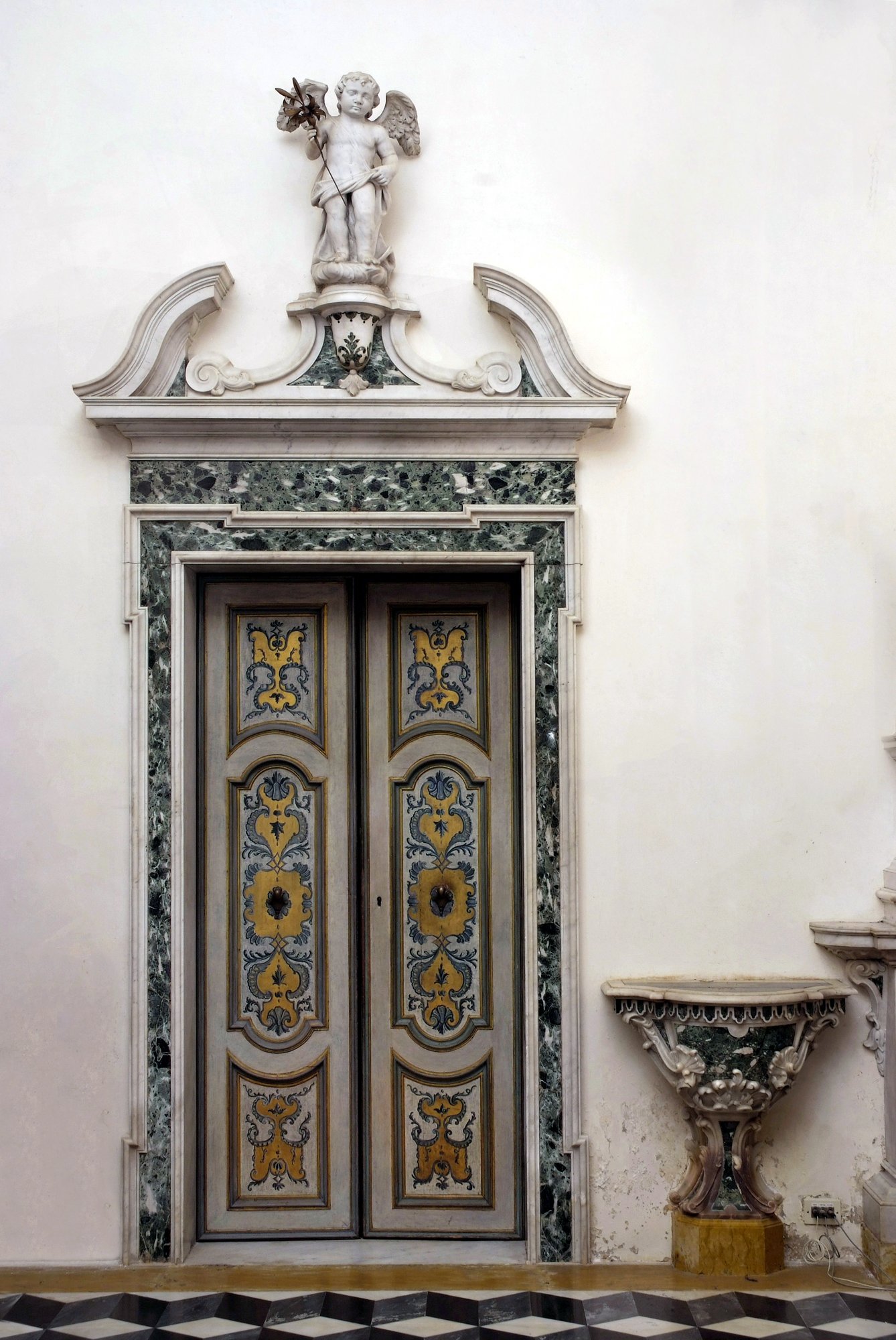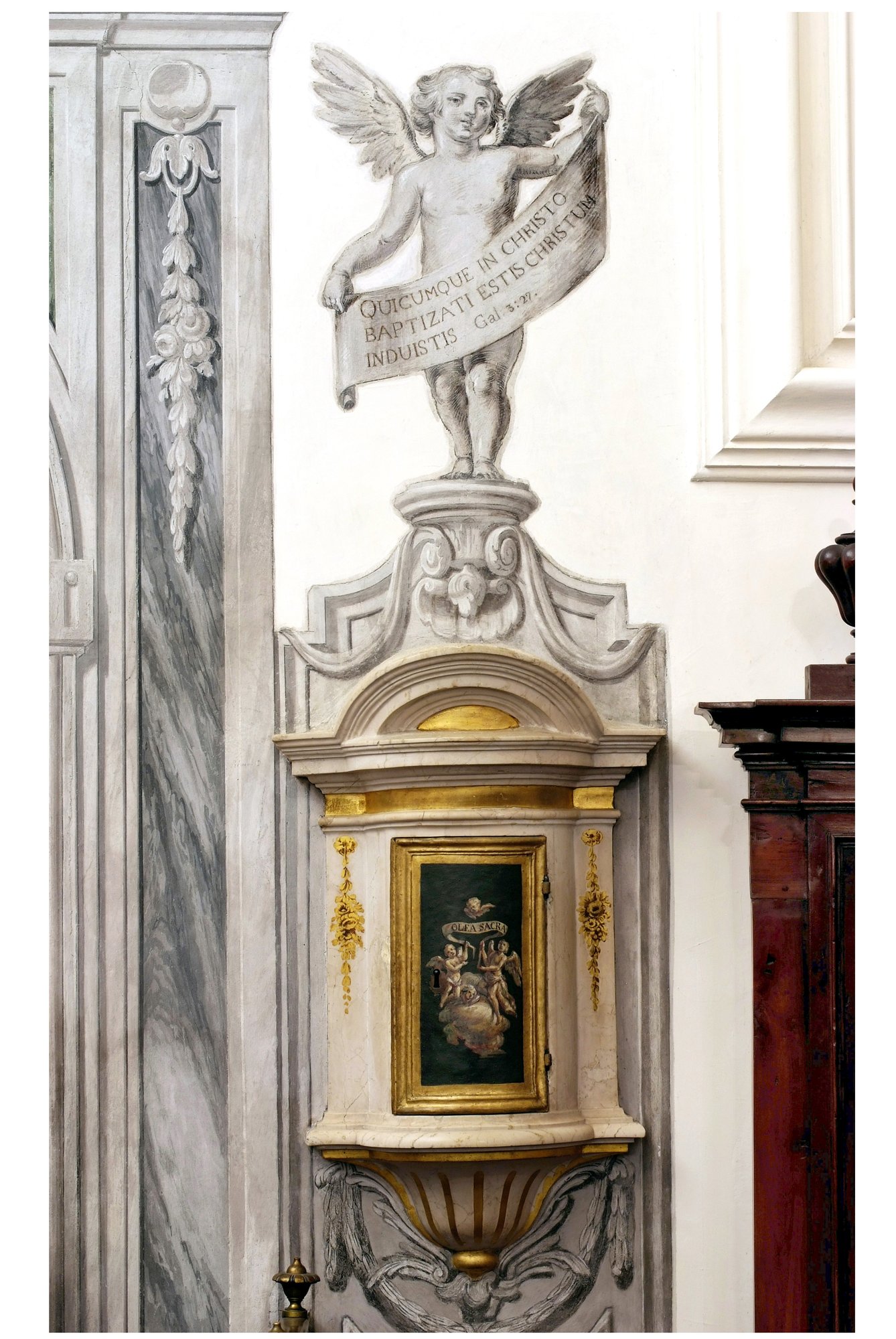 Più in alto, entro una targa commemorativa, si legge la dichiarazione d’intenti del patriarca nell’edificare l’oratorio: “Theatrum in scholam puellis doctrina cristiana imbuendis ac puritati sanctissimae virginis mariae dicatum anno MDCCLX” (Teatro dedicato l’anno 1760 in onore della Purità della Santissima Vergine Maria quale scuola per l’istruzione della Dottrina Cristiana alle fanciulle) .