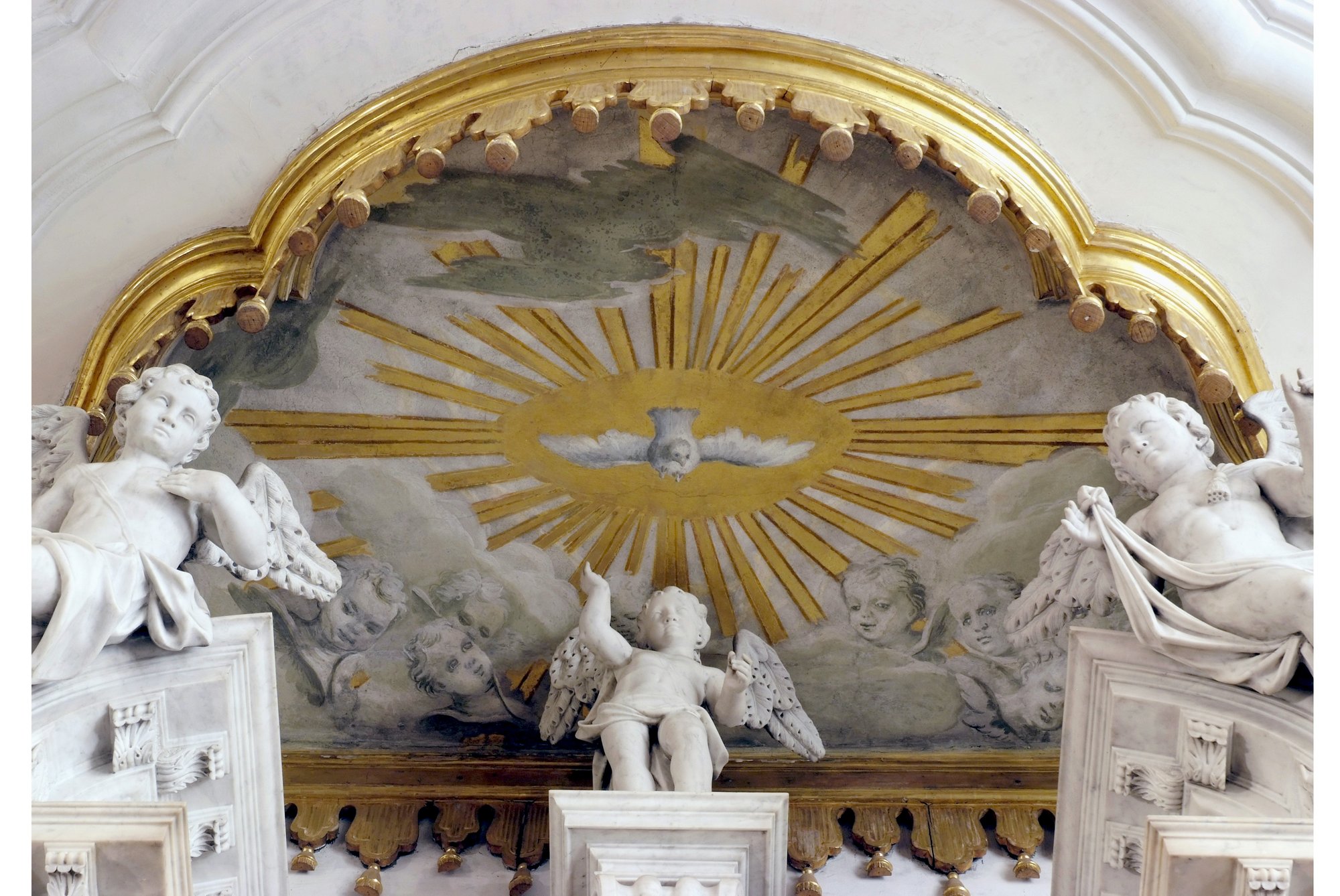 Se Giambattista firma con l’Assunta il momento più alto della sua esperienza udinese, il figlio Giandomenico Tiepolo nei chiaroscuri su fondo oro, eseguito da Pietro Lavariano, pur conscio del debito con l’arte paterna, ne dichiara la propria indipendenza regalando una trama pittorica che, già accennata dal padre nei monocromi della Galleria degli ospiti in Palazzo patriarcale, diverrà in loco fonte di ispirazione quasi obbligata per la pittura neoclassica. La suddivisione dei compiti, fatta con ogni probabilità dagli stessi pittori, si basò sulla naturale propensione di Giandomenico per il disegno, che lo avrebbe portato a prediligere il monocromo anche in altre occasioni sia prima (affreschi nella villa Tiepolo di Zianigo, oggi a Ca’ Rezzonico a Venezia) che dopo Udine (affreschi nella villa Pisani di Stra), qualificandosi quindi come vero specialista nella pittura a grisaille.