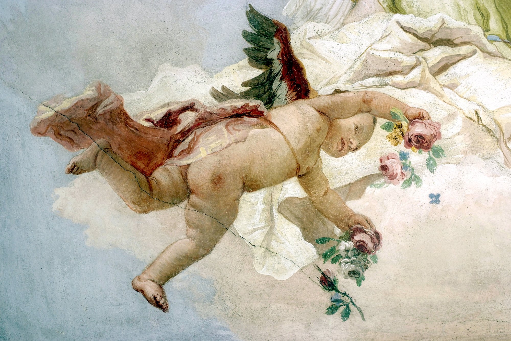 I preparativi per la realizzazione dell’affresco iniziarono nell’agosto del 1759 con la commessa al mercante veneziano Bernardo Scotti di fornire certe terre colorate chieste da Giambattista, per il quale furono acquistate nello stesso periodo dall’Andrioli anche scodelle, carta ed altro ancora per agevolare il lavoro. Ai primi di settembre il Delfino con la consueta scrupolosità annotò nel suo registro “De’ scossi e spesi” nuovi importi dovuti per i materiali necessari all’opera, e alla metà del mese riportò il primo pagamento ai Tiepolo per la realizzazione degli affreschi del soffitto, di quelli alla parete e per la pala d’altare. Agli inizi di ottobre le impalcature erano già state smantellate: ciò significa che Giambattista nel soffitto e il figlio Giandomenico alle pareti, proseguirono simultaneamente nella decorazione a fresco per ultimare il lavoro nei tempi e nelle condizioni climatiche ottimali.